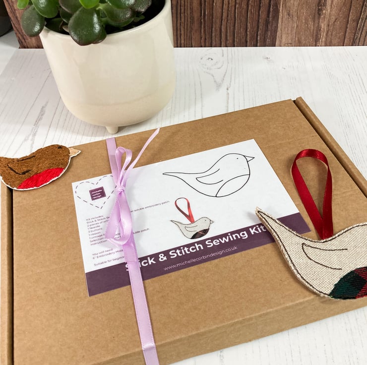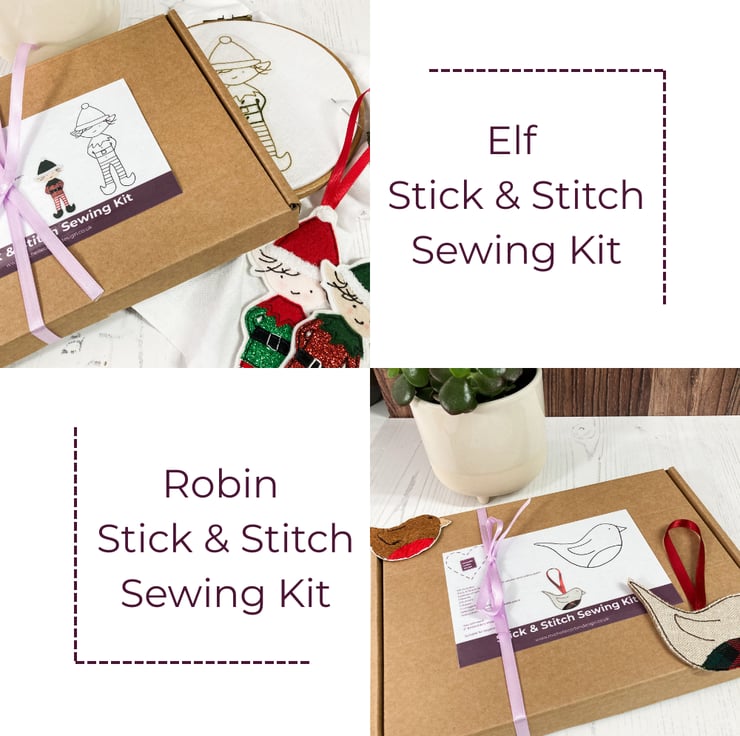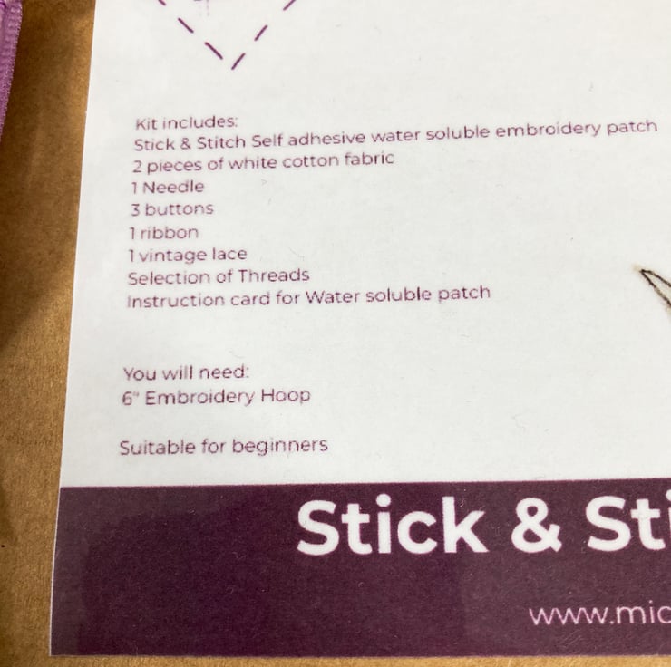 Each Stick and Stitch kit includes a stick and stitch template made from water soluble fabric, 2 pieces of cotton fabric, an embroidery needle, selection of DMC threads, a stitch suggestion guide, instructions for the stick and stitch template plus a selection of embellishments.