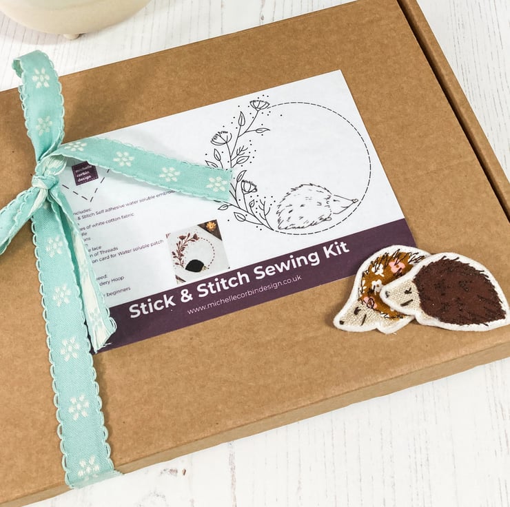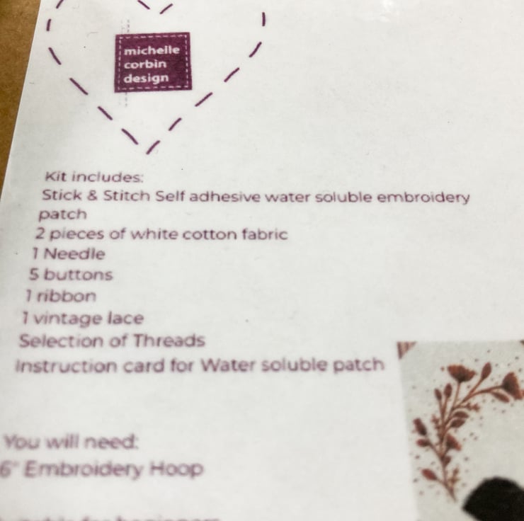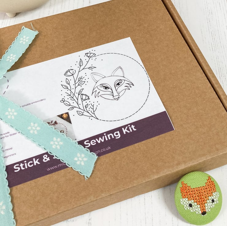 Each Stick and Stitch kit includes a stick and stitch template made from water soluble fabric, 2 pieces of cotton fabric, an embroidery needle, selection of DMC threads, a stitch suggestion guide, instructions for the stick and stitch template plus a selection of embellishments.