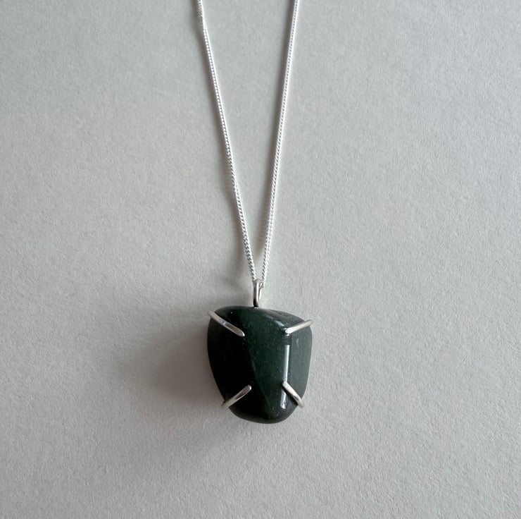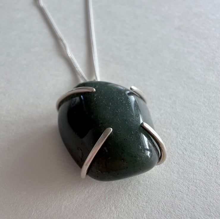 A unique aventurine polished stone secured in a silver claw setting and hung on a sterling silver chain.