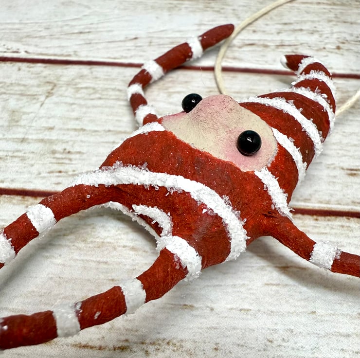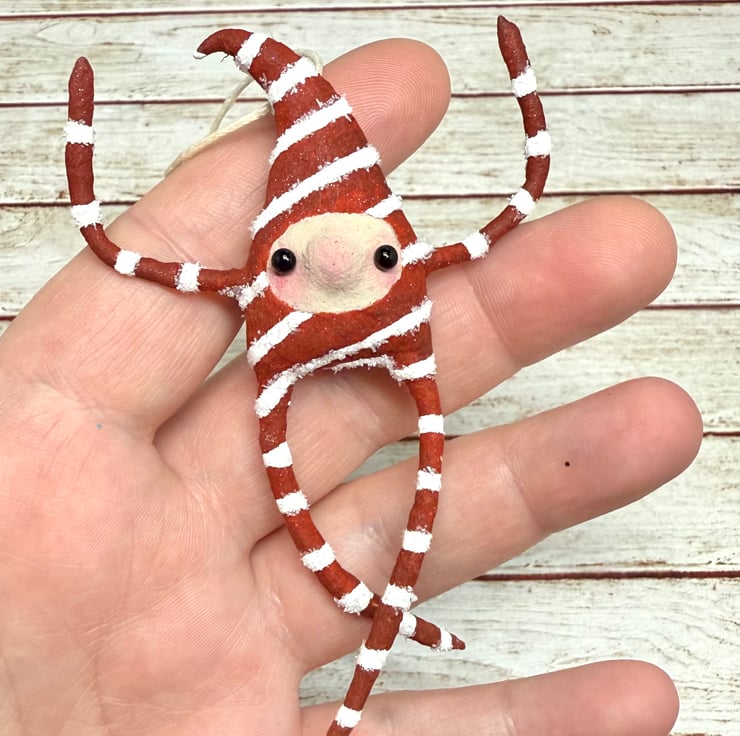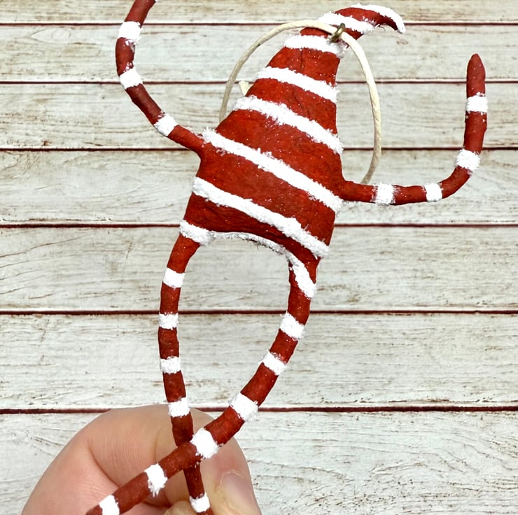 One of a kind spun cotton ornament made with a wire frame. Elf is hand painted in deep red and creamy white stripes. The white stripes are dusted with a little German glass glitter. The face is also hand painted with glass bead eyes. Elf has waxed thread hanger and measures roughly 9.5cm tall. This delicate item is for decorative purposes only and not a toy. Sent in recycled or recyclable packaging.