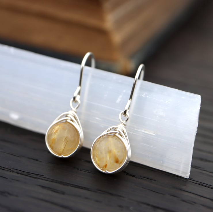 Golden Rutile Quartz gemstone drop earrings, wire wrapped with sterling silver wire.