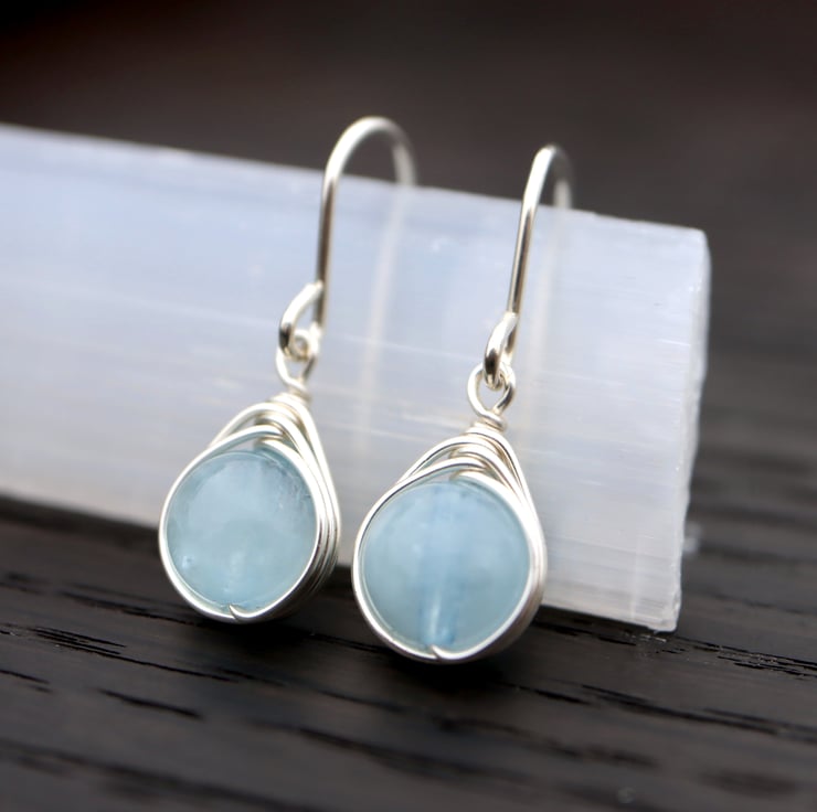 Blue Aquamarine gemstone drop earrings, wire wrapped with sterling silver wire.