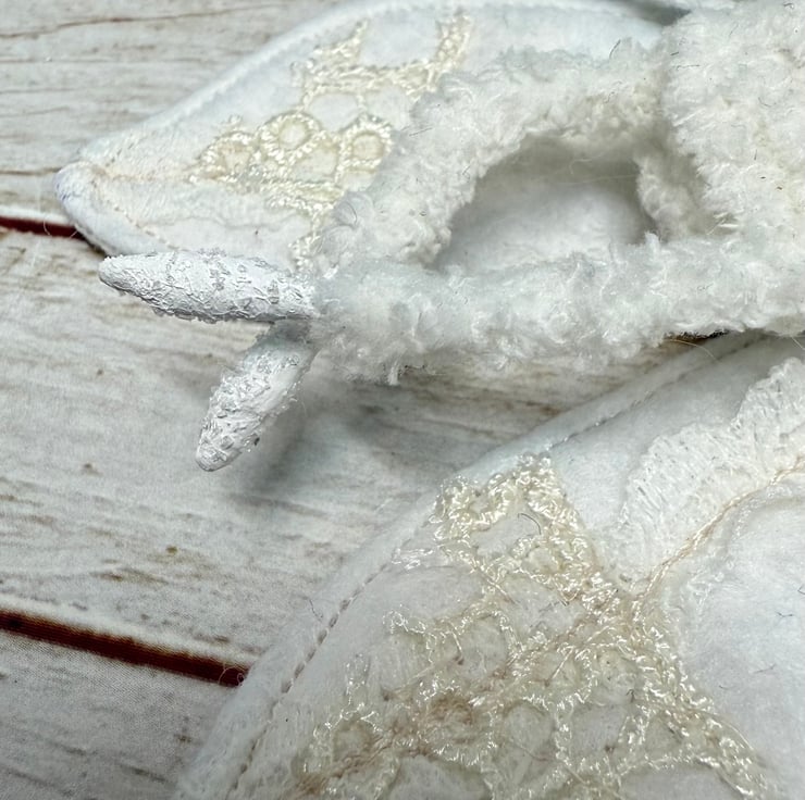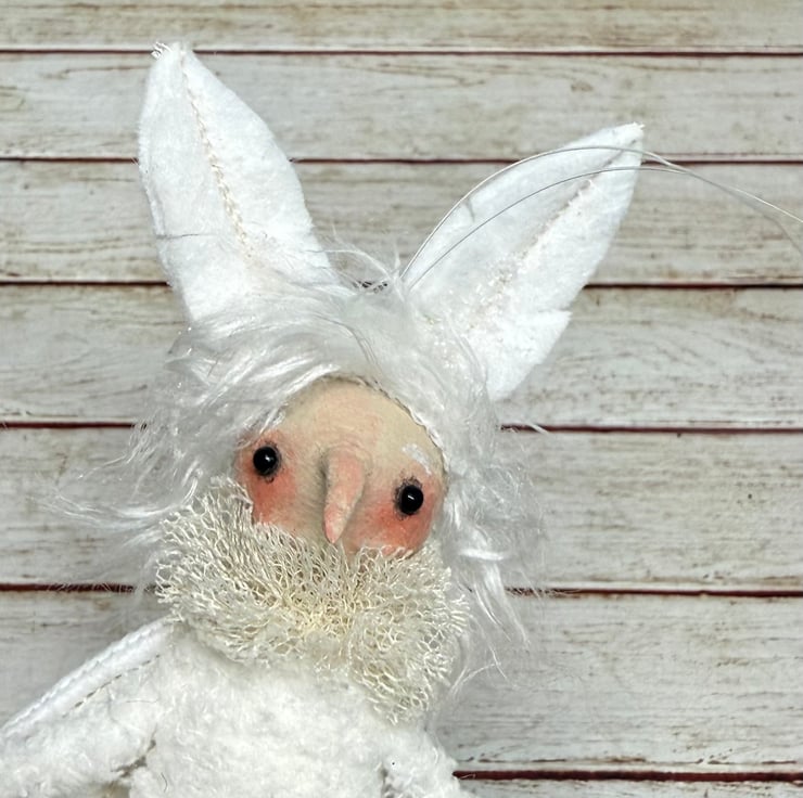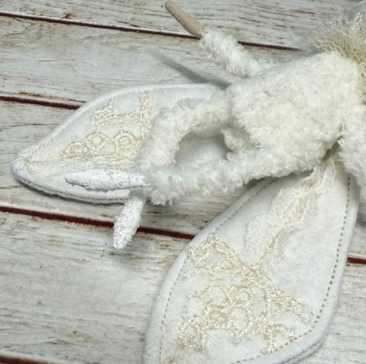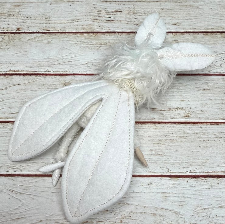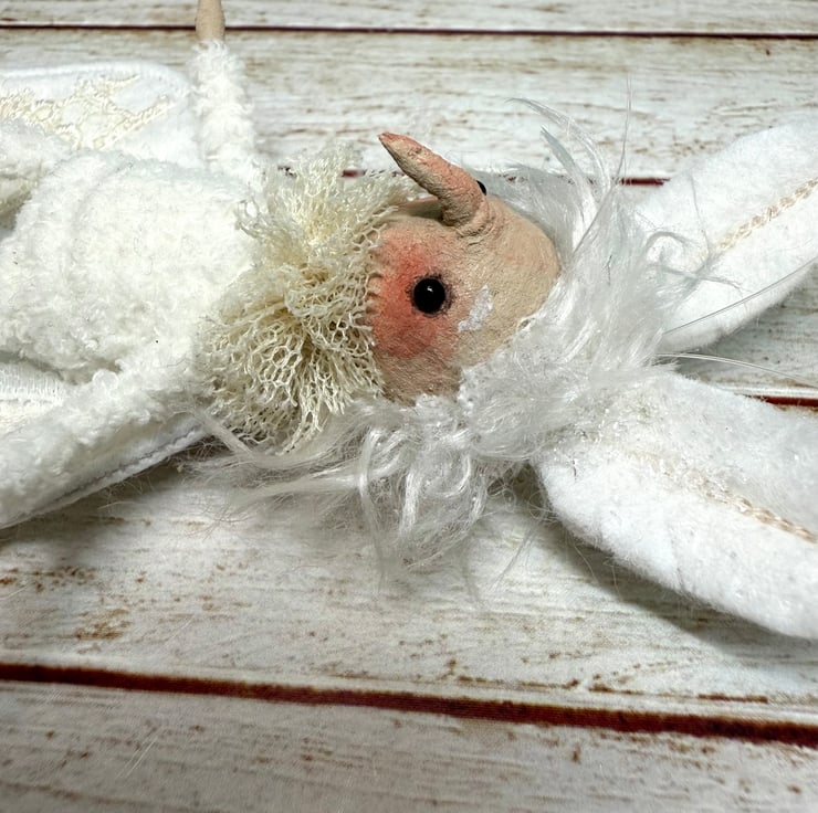 Miniature doll with wire frame that enables you to pose the arms and legs. Spun cotton doll with hand painted face, hands and feet. Doll has faux fur white hair and hand cut felt antenna. Doll body is covered with fluffy yarn and the feet are dusted with glitter. Wings are felt with free motion embroidering and trim details. Doll comes with transparent loop hanger attached and measures roughly 13cm tall. This is for decorative purposes only and not a toy. Sent in recyclable or recycled packaging.