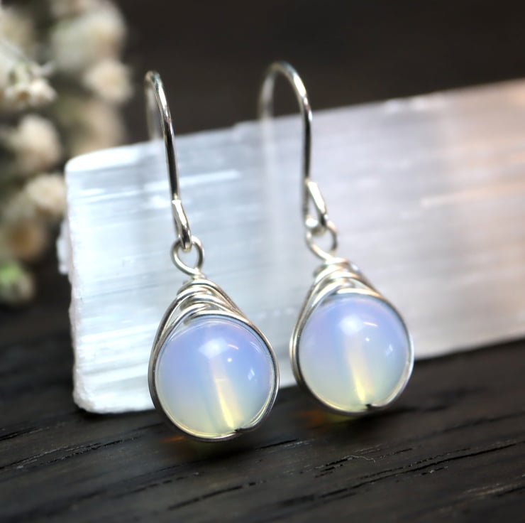 Opalite gemstone drop earrings, wire wrapped with sterling silver wire.