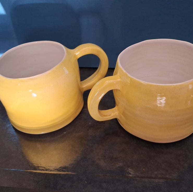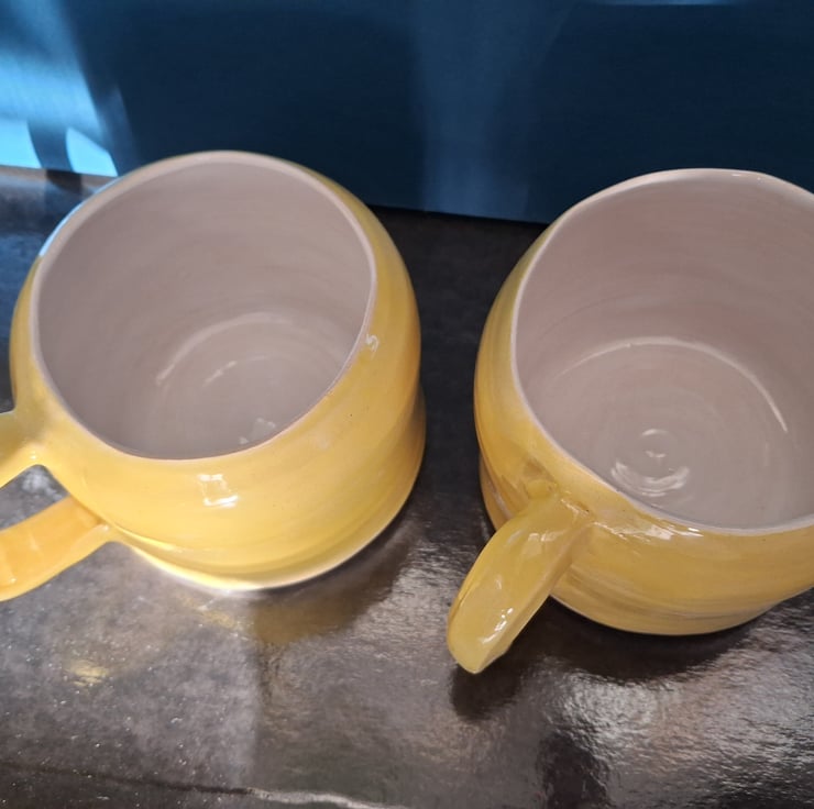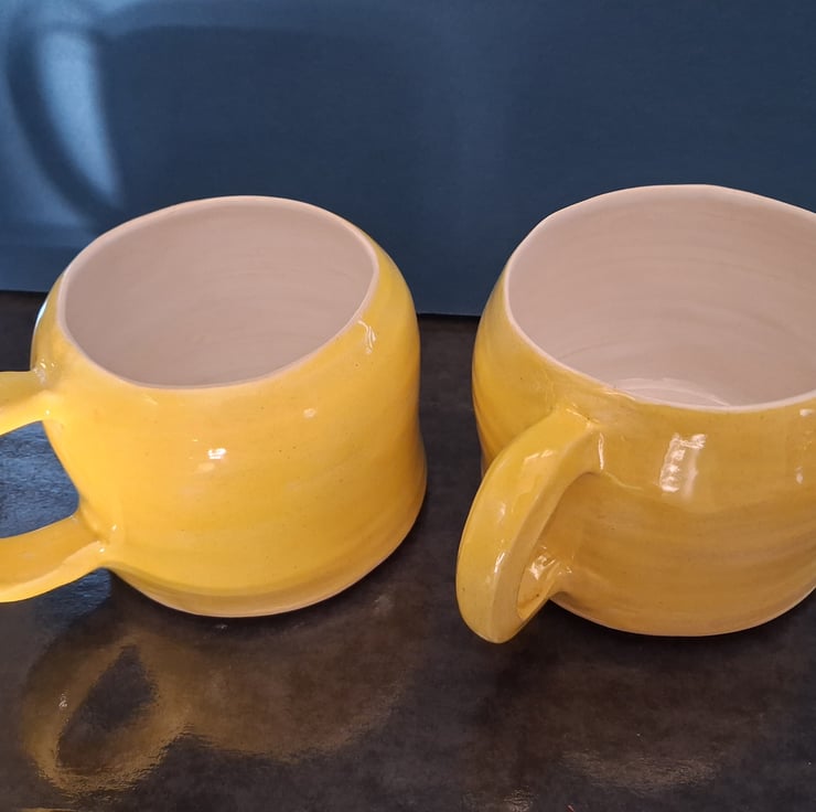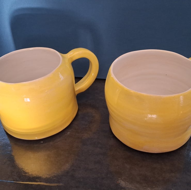 Beautiful handmade mugs in a rich and vibrant yellow on the outside and the handle with a crisp white on the inside.