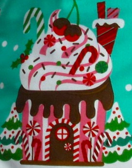 Choose from a pink or brown gingerbread house, or a chocolate sundae cottage. I can also do a hot chocolate one - there isn't one made up yet, but I've added a photo of the motif on the fabric.