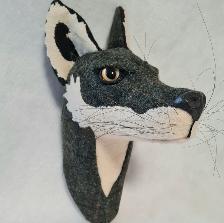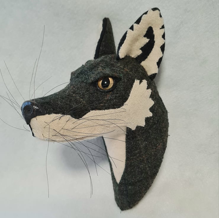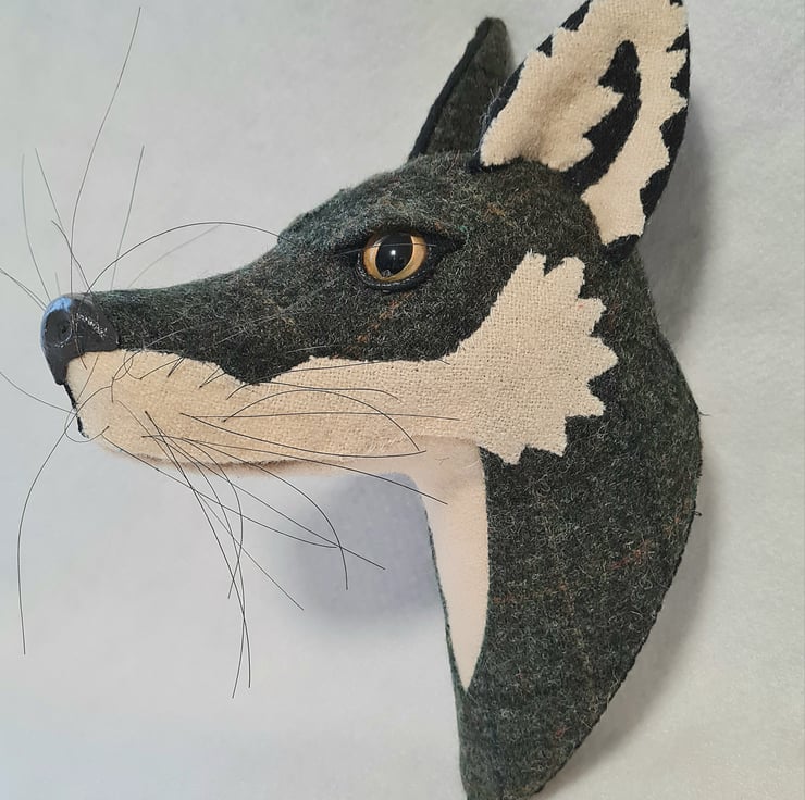 Meet Finbar: A lifesize faux fox head which I have handmade and covered in hand stitched dark green tweed tartan fabric with a subtle beige check. The nose is handmade from polymer clay. The head is backed with felt and has a metal hanger to hang it on the wall. It is lightweight.