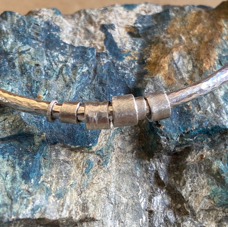 100% recycled hallmarked sterling silver bangle. 3mm round section hammered with silver textured tubes. 65mm internal diameter - average size.