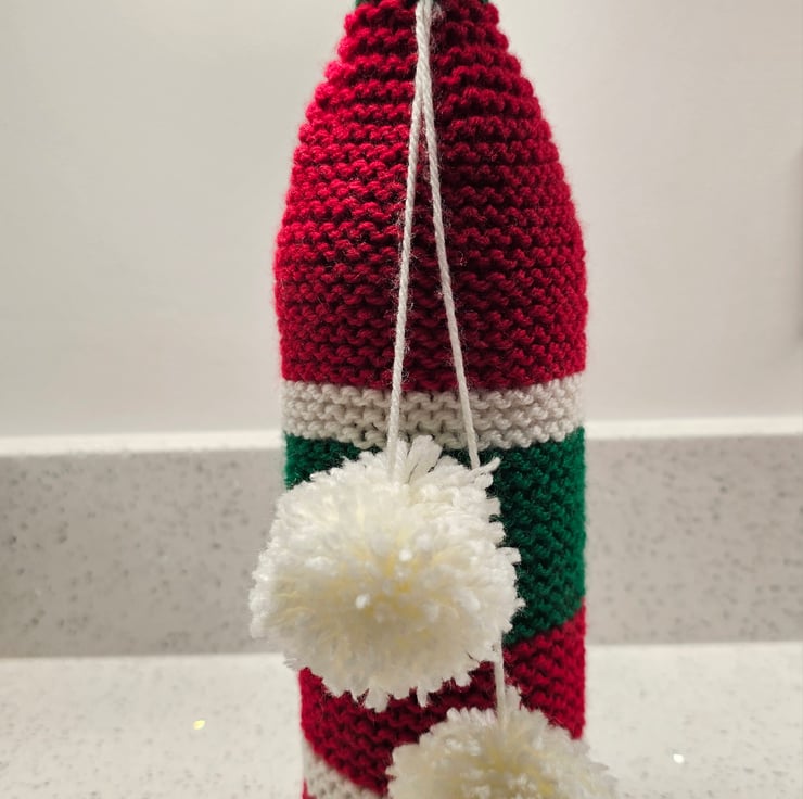 Design: Knitted bottle cover with contrasting neck and two large, fluffy pom-poms. (Photo 2 is for illustration only to show what a bottle cover looks like on a bottle. Bottle not included).