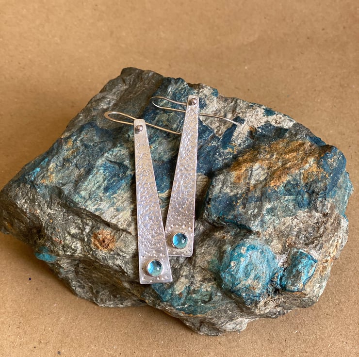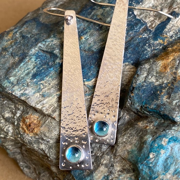 100% recycled Sterling Silver earrings with a hammered finish and 5cm Swiss Blue topaz cabochon.