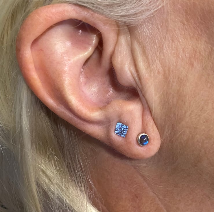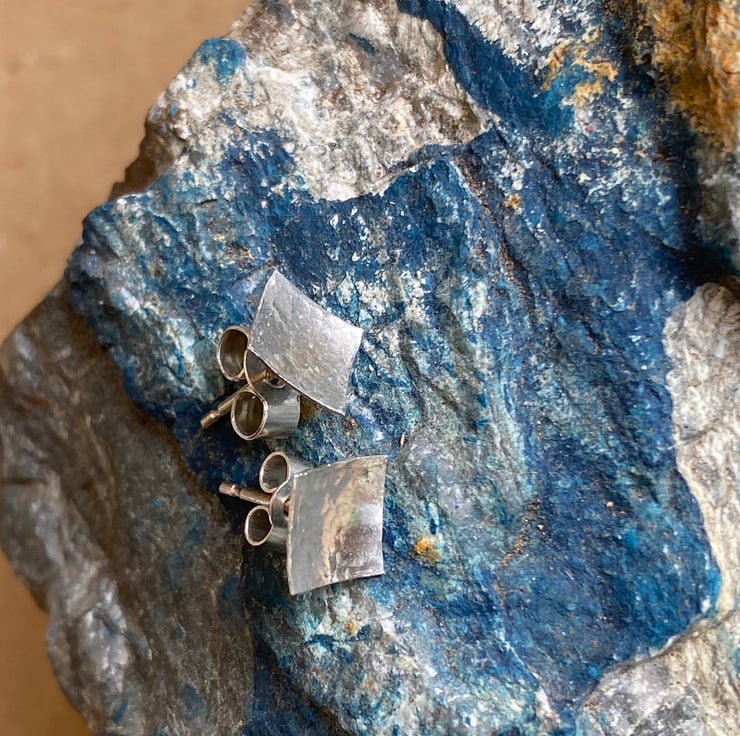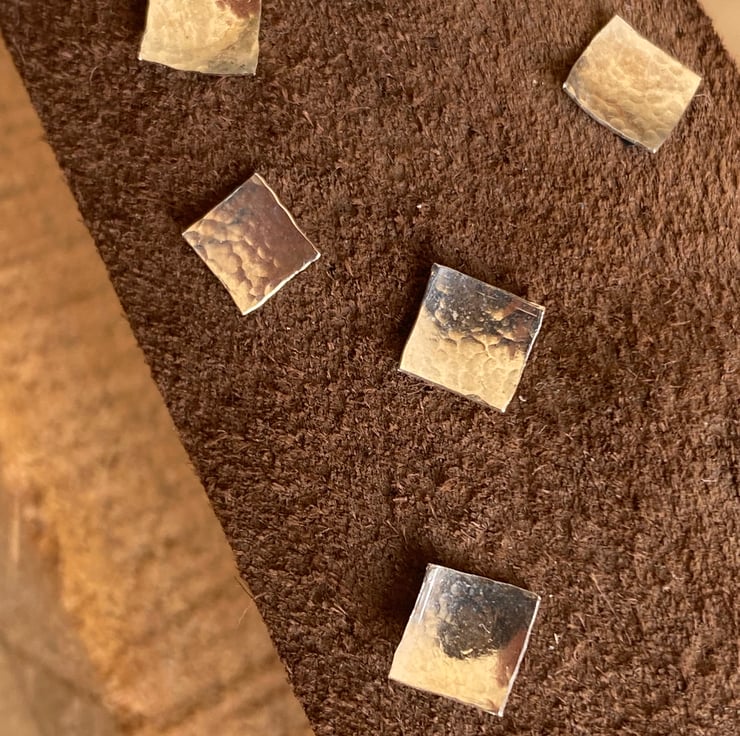 Dainty square hammered studs, slightly concave to catch the light. Approx 5mm square but each one hand cut and finished so may vary slightly. Perfect for multiple piercings. (I wear mine on the second ear lobe piercing).