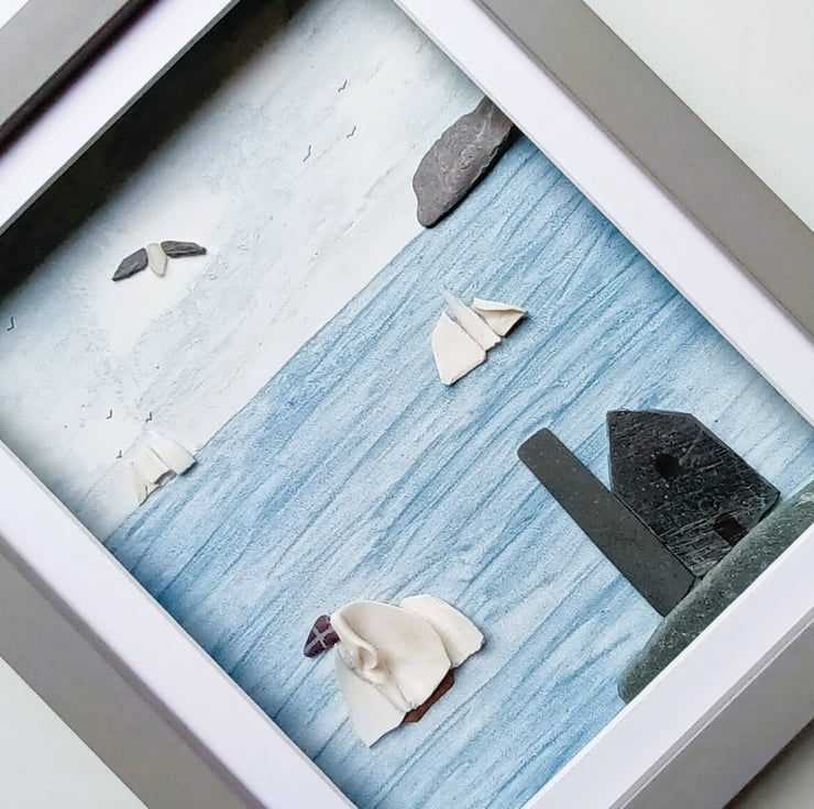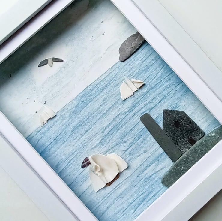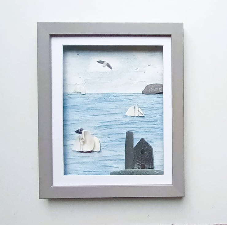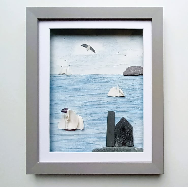 A Cornish tin mine engine house and passing tall ships made from stone and sea shells set inside a glass fronted box frame.