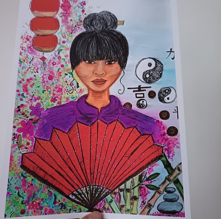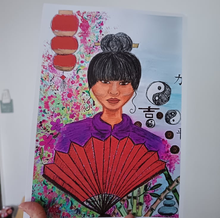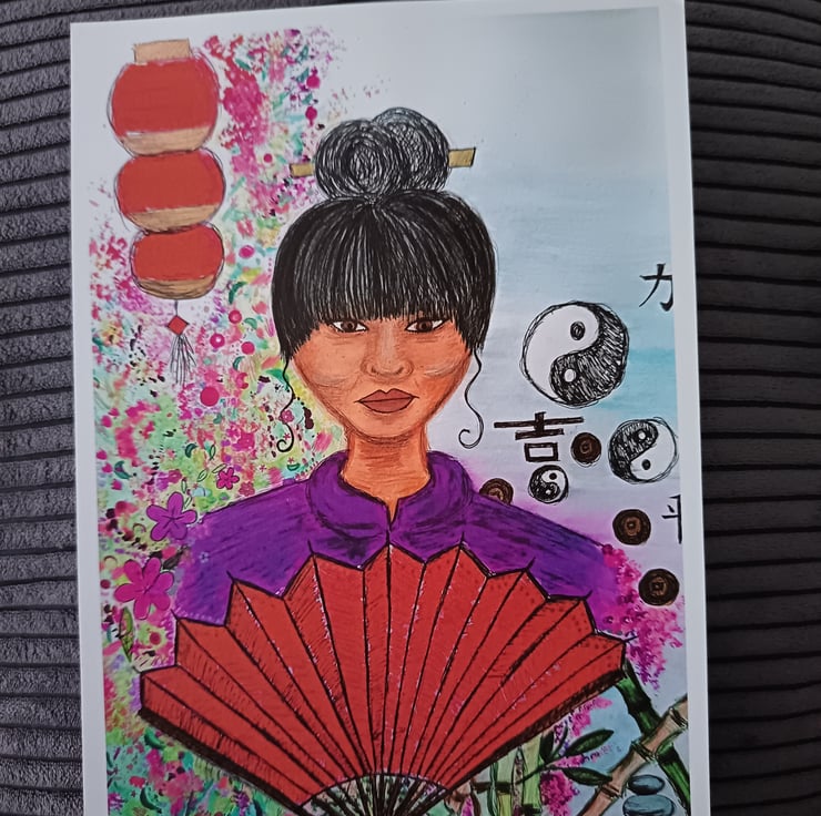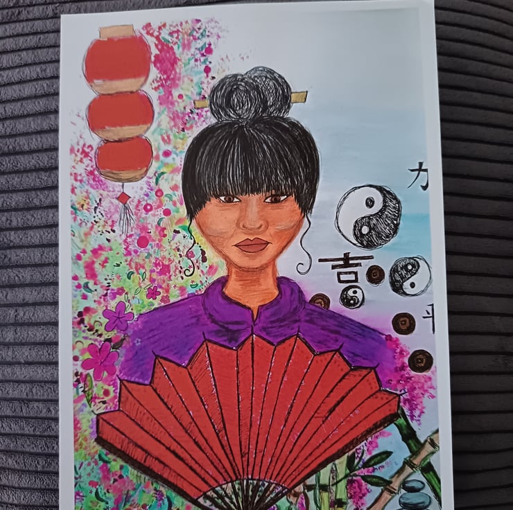 This A4 print features my original painting Lady of China on 300 gsm matte paper. I used mixed media to create this piece: watercolour, acrylic paint and various pens and markers. It is a vibrant portrait of a Chinese lady, featuring a red fan, Chinese lamp and cherry blossom, as well as Chinese symbolism and Yin & Yang signs.