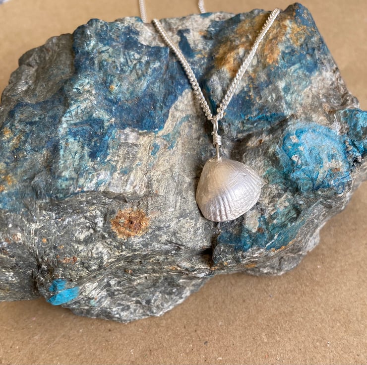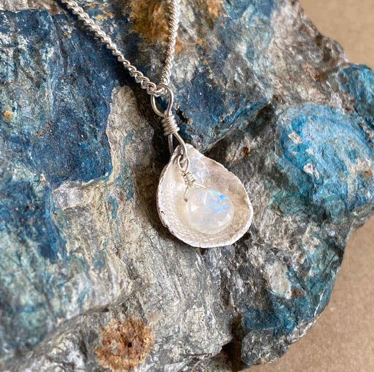 A solid fine silver shell, made from a mould of a cockle shell found on a Cornish beach. Hanging within it is a beautiful iridescent Rainbow Moonstone briollete, faceted to catch the light. On a delicate 18 inch diamond cut curb chain. Presented in a black velvet pochette.