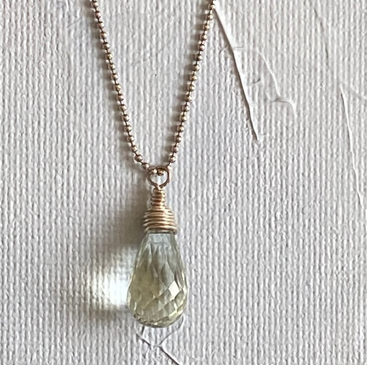 A delicate faceted pale green Amethyst teardop briolette, approx 1cm long and 6mm at its widest. Hangs from a pretty 18" bille chain. Presented in a black velvet pochette.