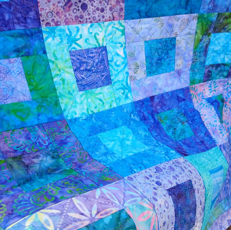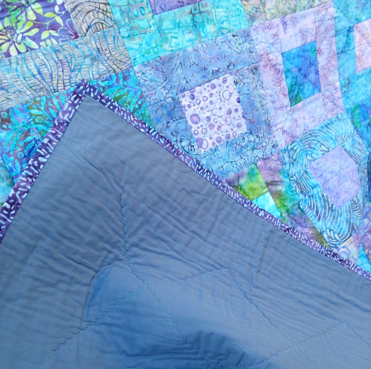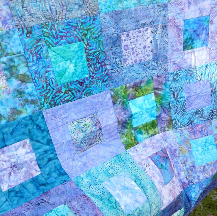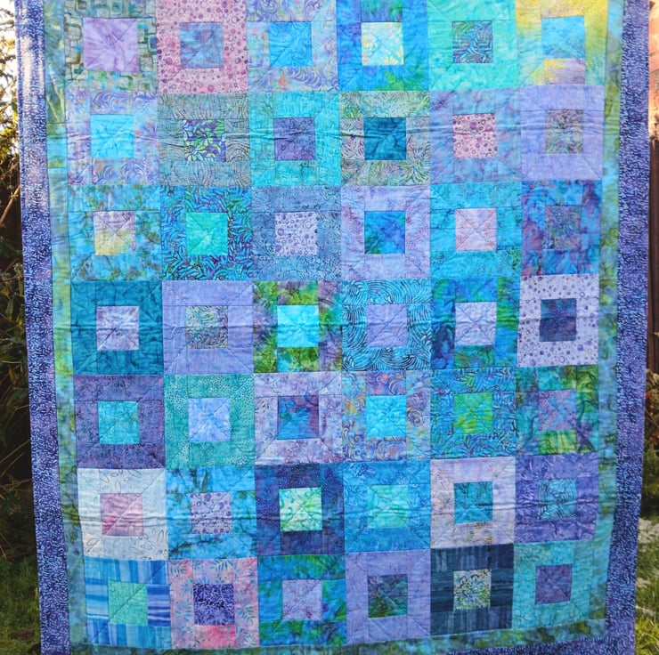 Beautiful square in square design quilt with quality batik cotton fabrics. Thread, top fabrics and backing are 100% cotton. Wadding is 80% cotton, 20% polyester.