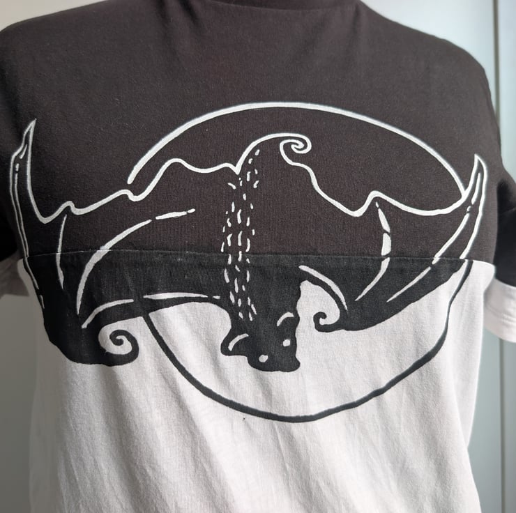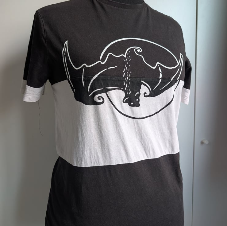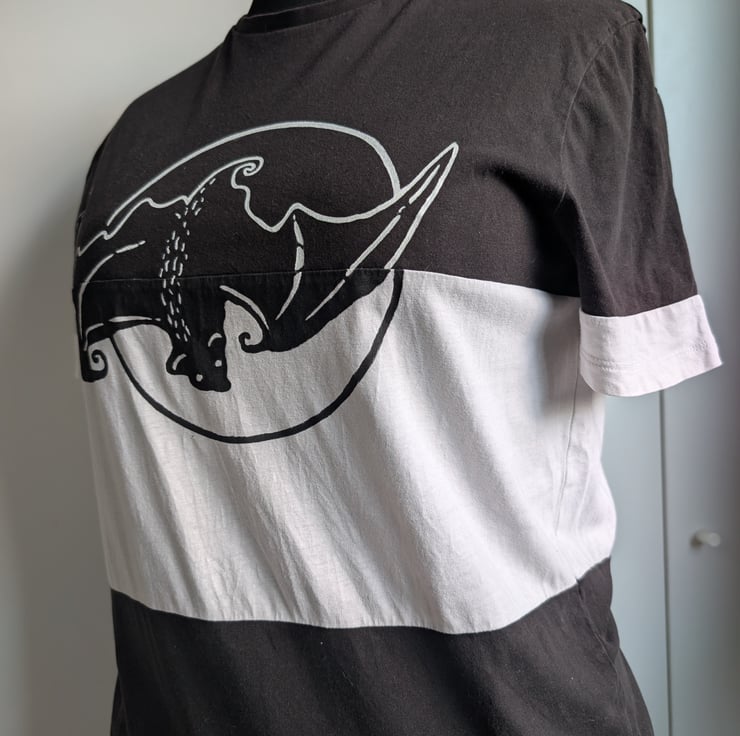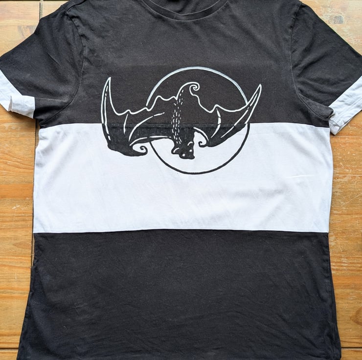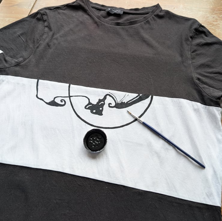 This design has been hand-painted onto a black and white upcycled t-shirt, using biodegradable fabric paints.