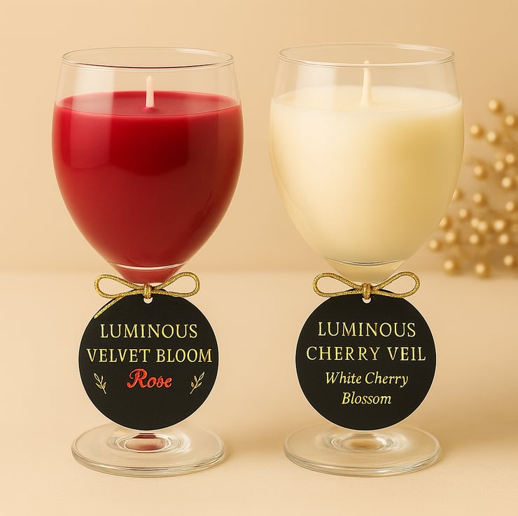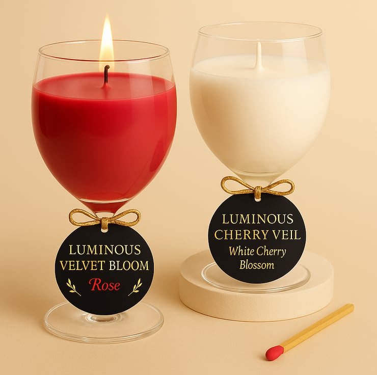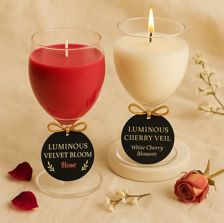This set pairs Velvet Bloom (Rose) — a deep, wine-red candle inspired by evening romance — with Cherry Veil (White Cherry Blossom), a delicate floral blend that feels light, pure, and beautifully uplifting.