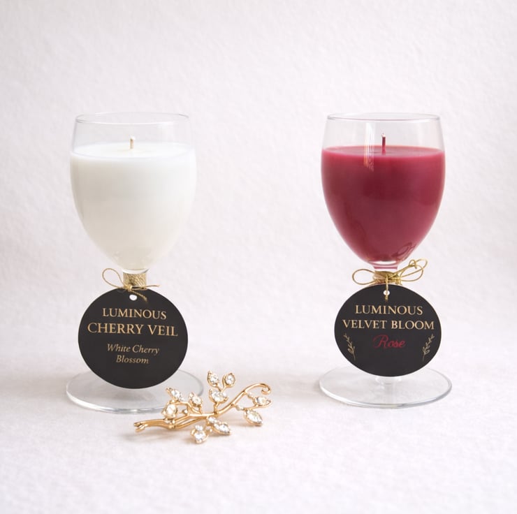 This set pairs Velvet Bloom (Rose) — a deep, wine-red candle inspired by evening romance — with Cherry Veil (White Cherry Blossom), a delicate floral blend that feels light, pure, and beautifully uplifting.