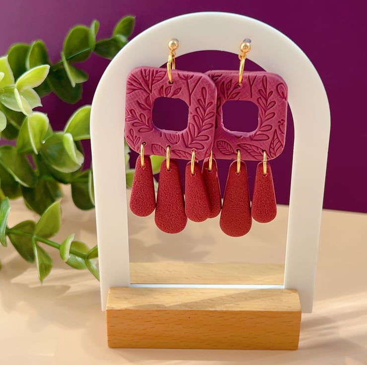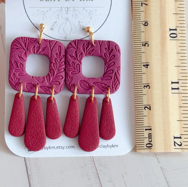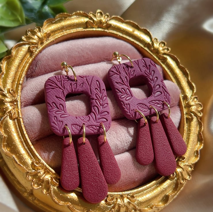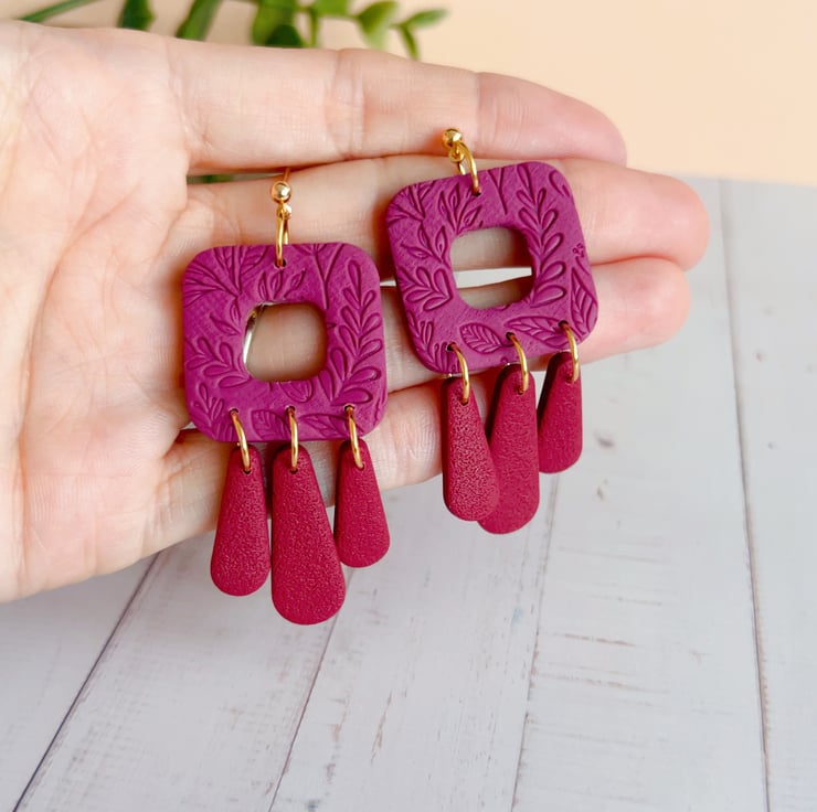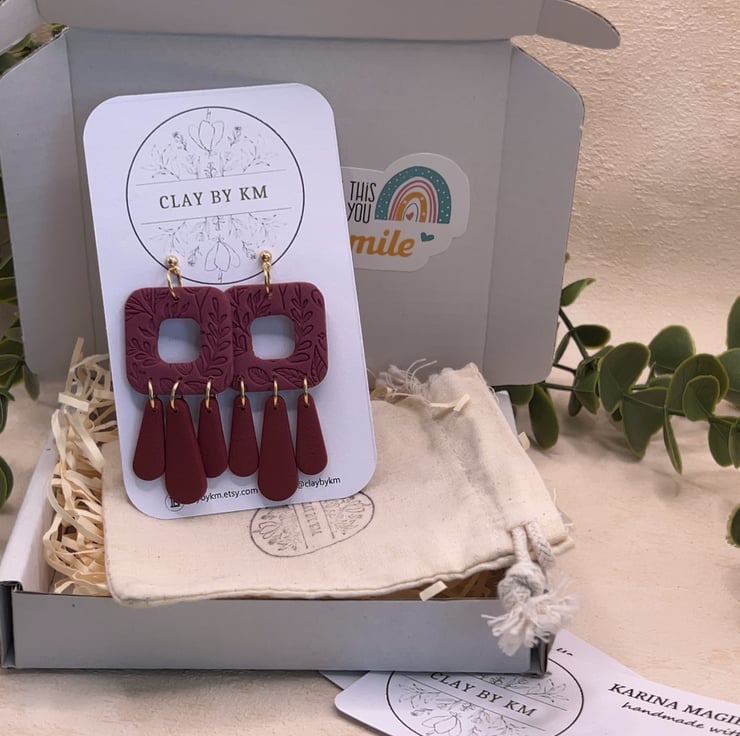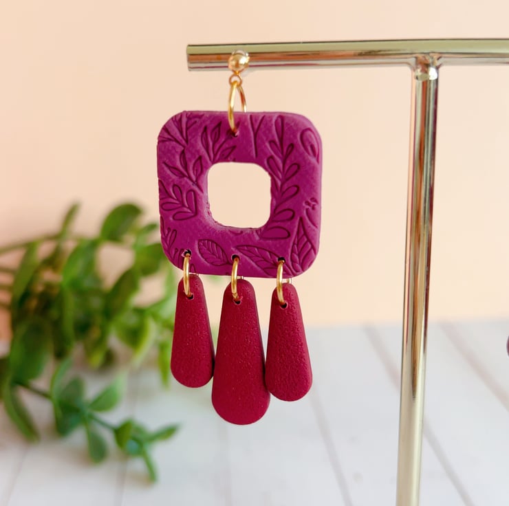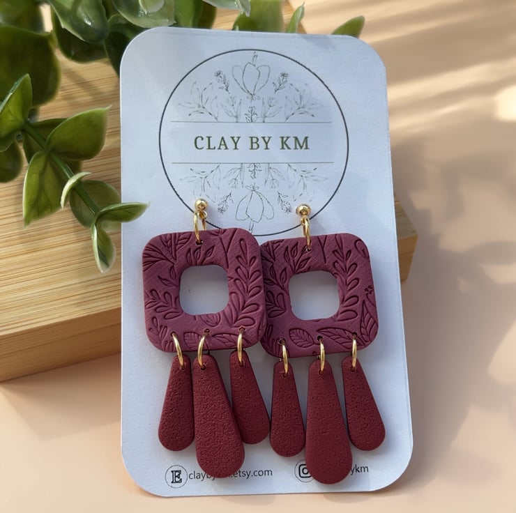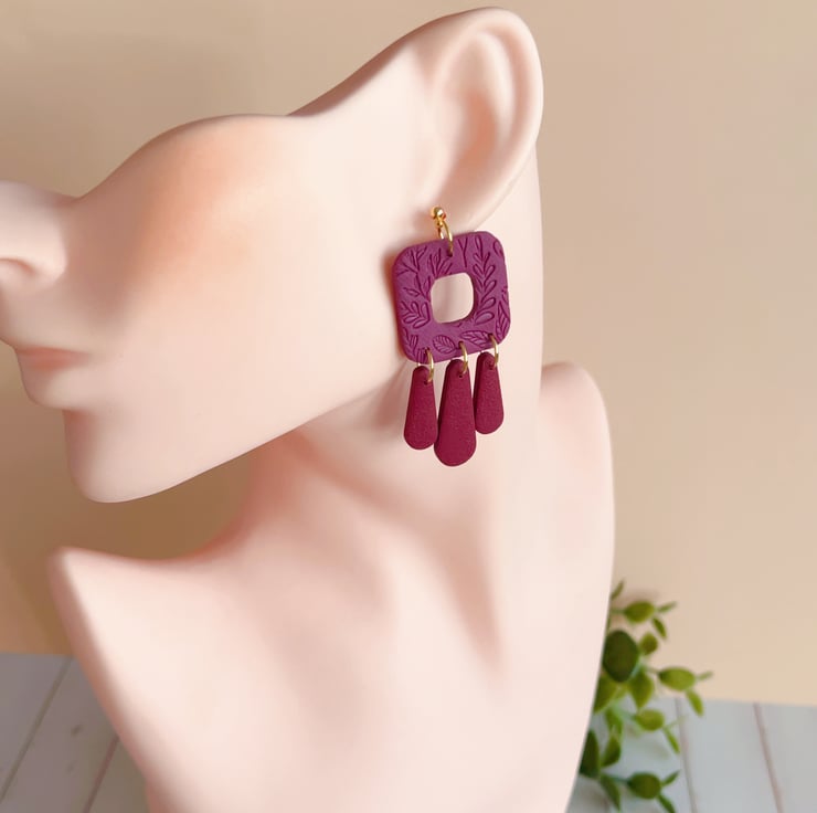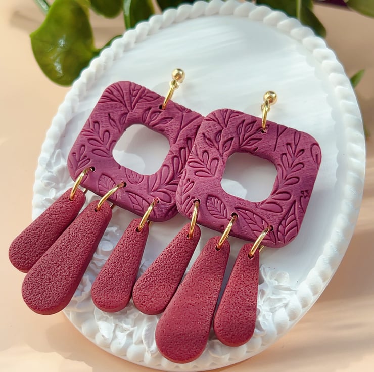 Elegant burgundy polymer clay earrings with a soft matte texture and botanical embossed detail. A lightweight statement design - eye-catching, but comfortable enough for all-day wear.