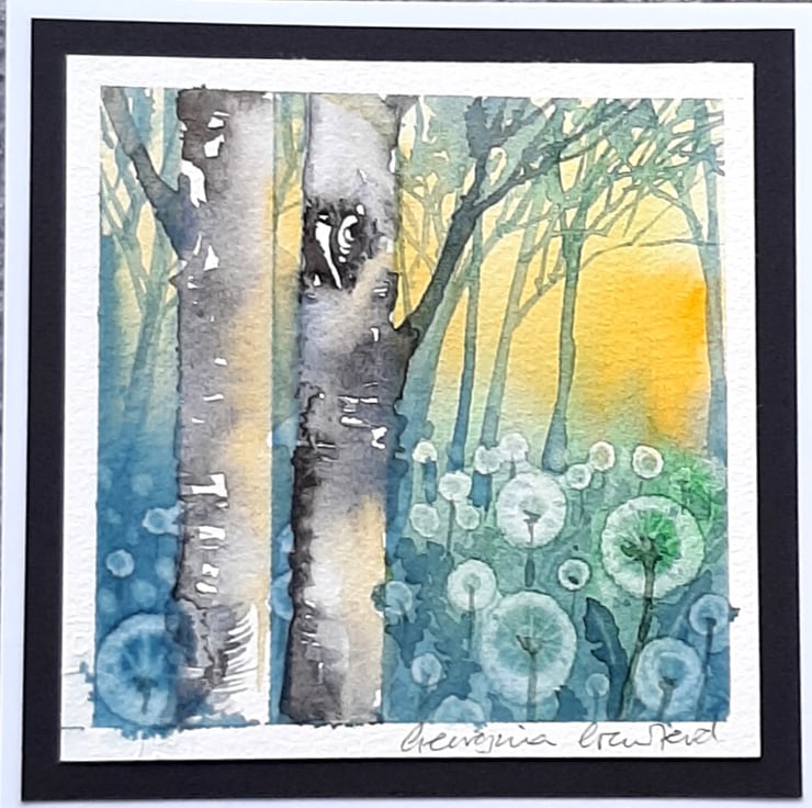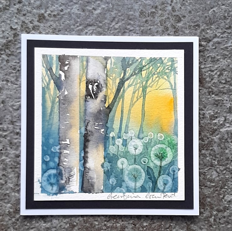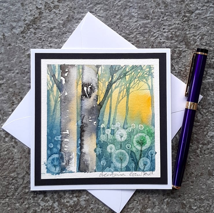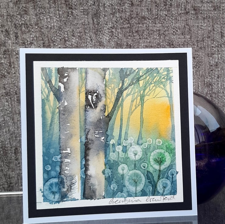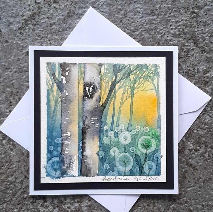 A beautiful watercolour painting of light filtering through Birch trees with dandelion Clocks, made into a card and ideal to send as a gift for framing. There's plenty of space for you to write your message inside.