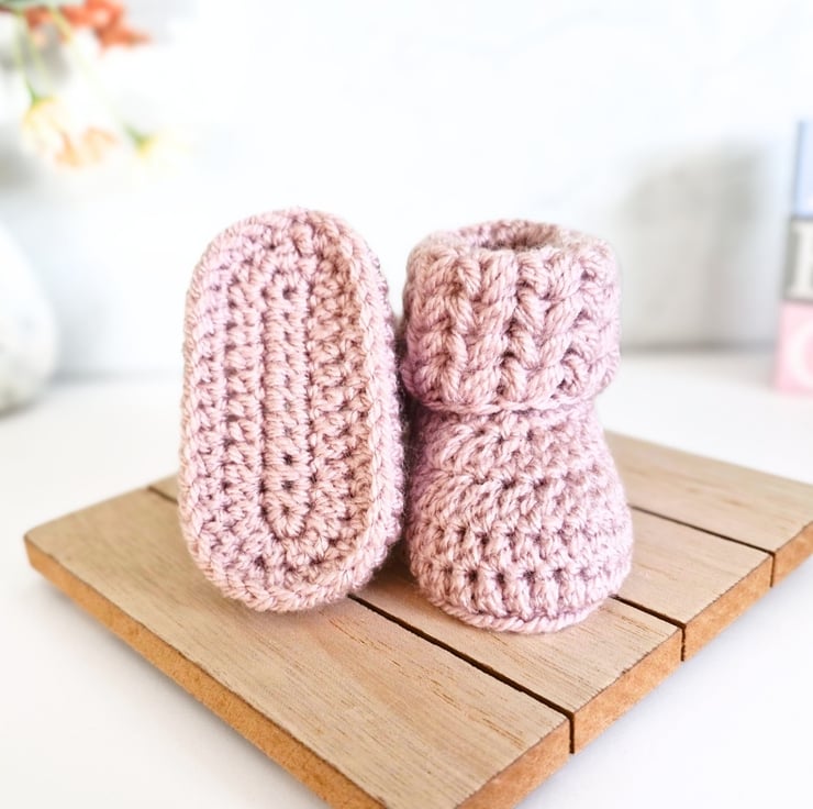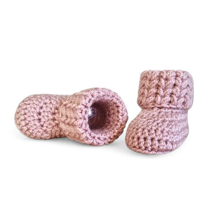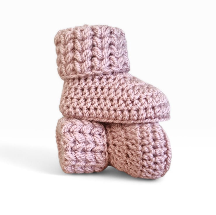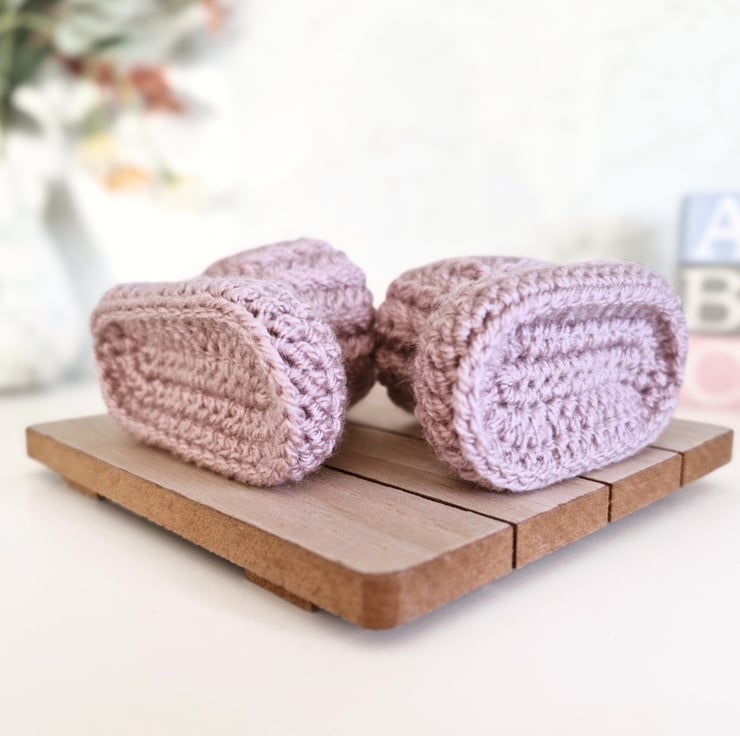 A lovely little pair of handcrafted newborn booties, crocheted in a soft mushroom shade that pairs beautifully with any outfit. Made with care using a cosy yarn, they’re gentle on tiny feet and ideal for those early days at home or as part of a special coming-home outfit.