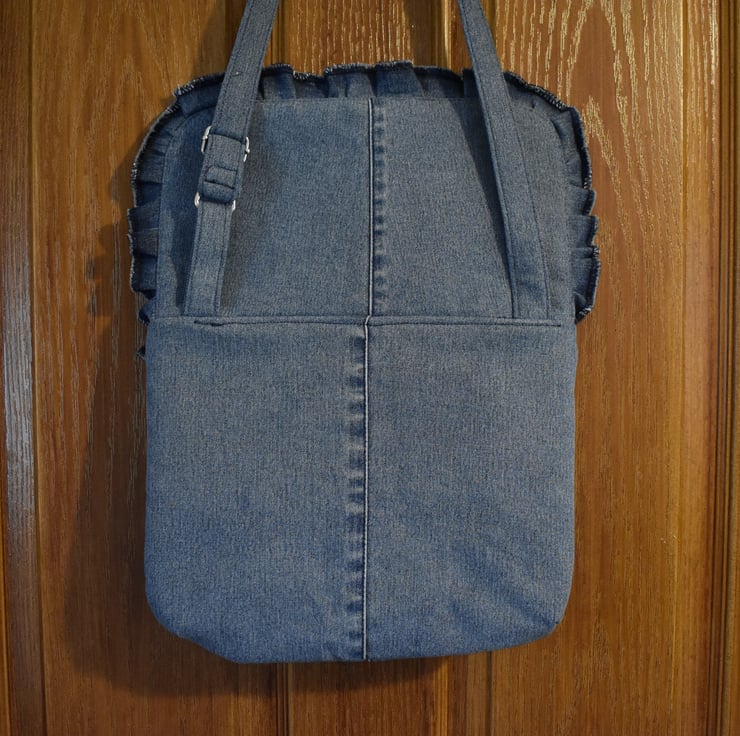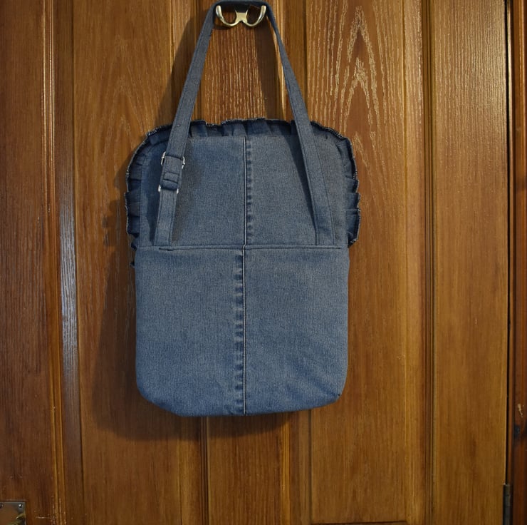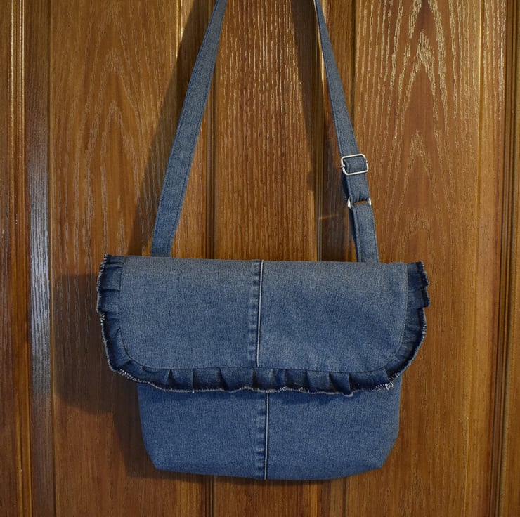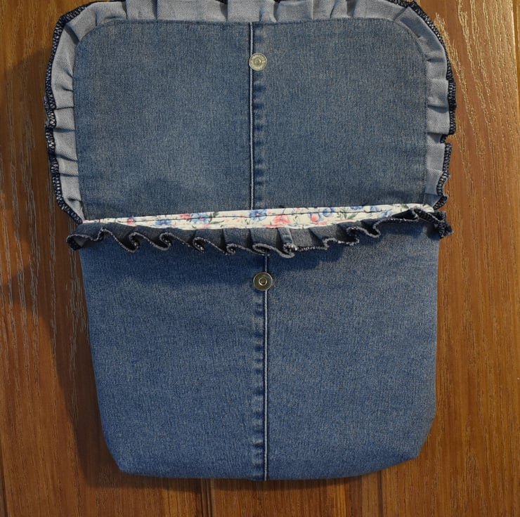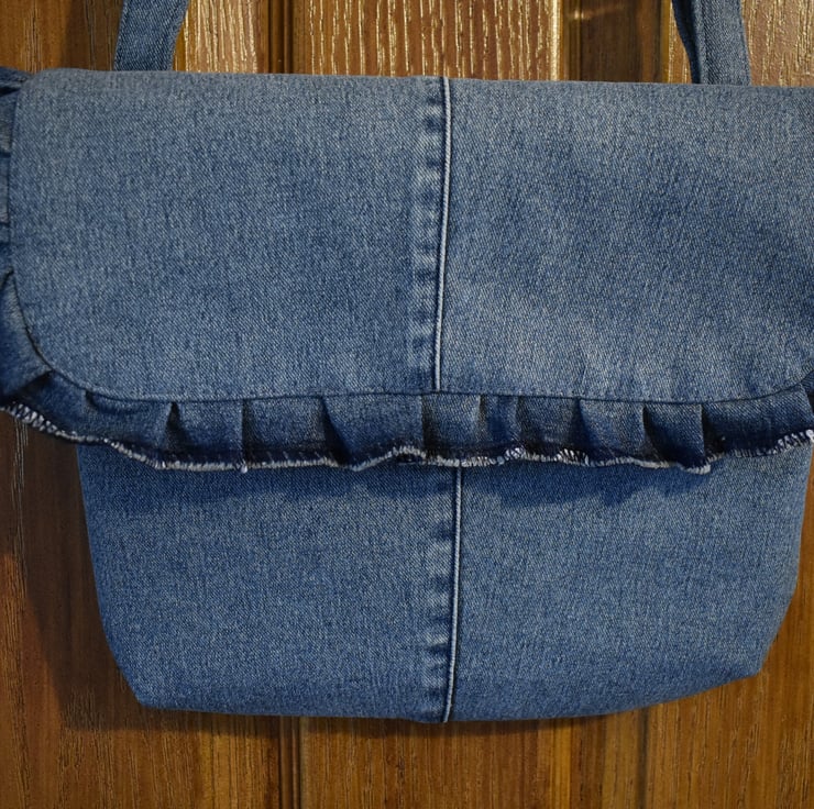 Repurposed blue denim handbag, shoulder or hand held strap length. Décor frill.
