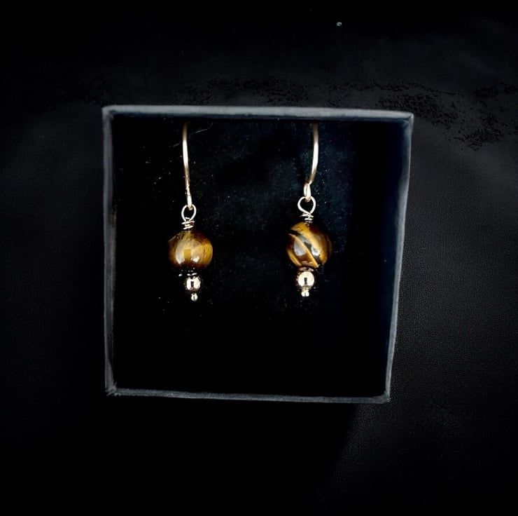 These beautiful earrings are made from quality tarnish resistant gold plated jewellery wire featuring beautiful vibrant semi precious Tigers Eye stone.
