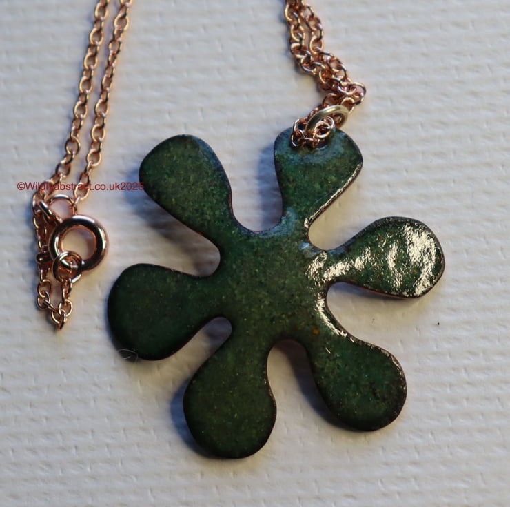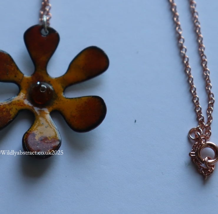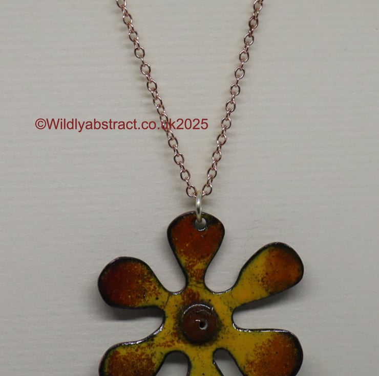 This pretty pendant was handcrafted using a hand-pierced copper flower shape. The flower was coated a base coat of yellow enamel and then a second coat of orange enamel was spinkled around the edges of the petals. It was counter-enamelled and fired in the kiln to fuse the enamel to the base metal. The pendant is hung with a jump ring on a gold plated trace chain. It measures 4cms x 3.5cms with a total necklace length of 28cms.