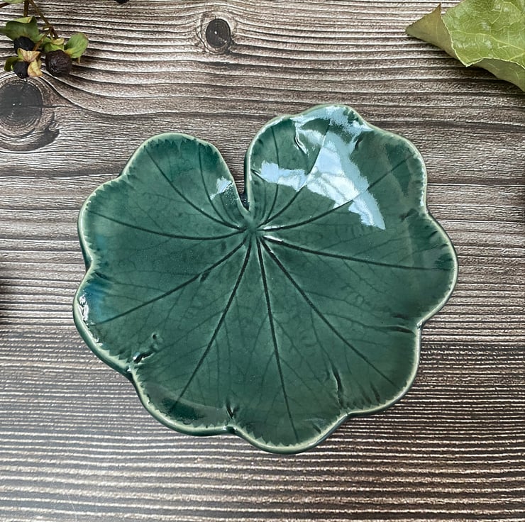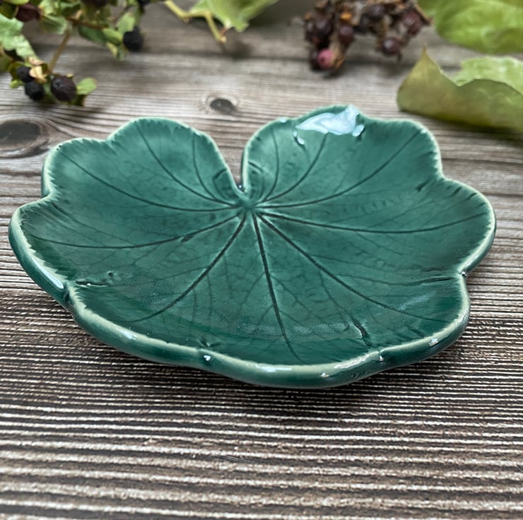 This ceramic leaf dish is made using creamy stoneware clay in which I have pressed a real leaf to create a detailed imprint of its veins and organic shape. The dish is glazed in a rich green finish that highlights its natural texture and is fired to 1200°C for strength and durability.