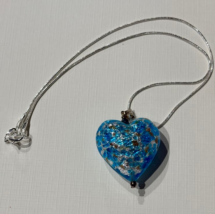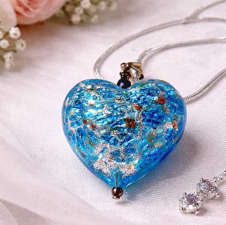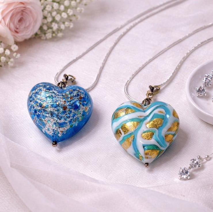 This beautiful light blue Murano glass heart necklace is a real treasure for anyone who loves artisan jewellery and the magic of Venetian glassmaking. The heart-shaped pendant is genuine Murano glass, imported directly from Italy, handmade using traditional lampwork techniques and finished with soft flecks of silver and gold leaf that shimmer gently in the light.