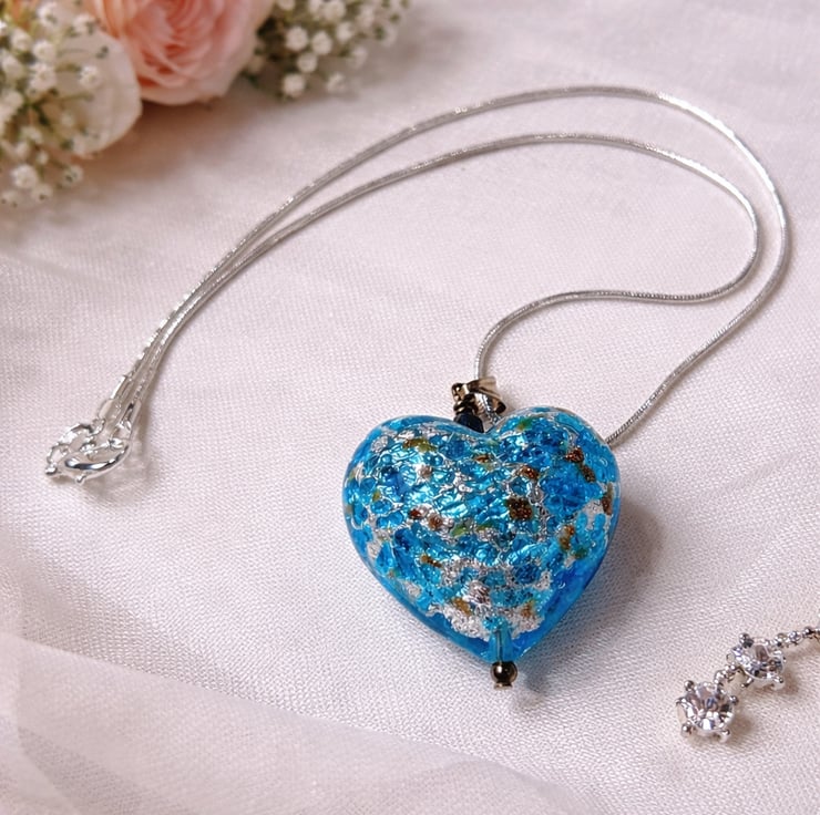 Light Blue Murano Glass Heart Necklace – Genuine Italian Glass with Silver & Gold Leaf, Handmade Pendant with Silver Plated Chain & Gift Bag