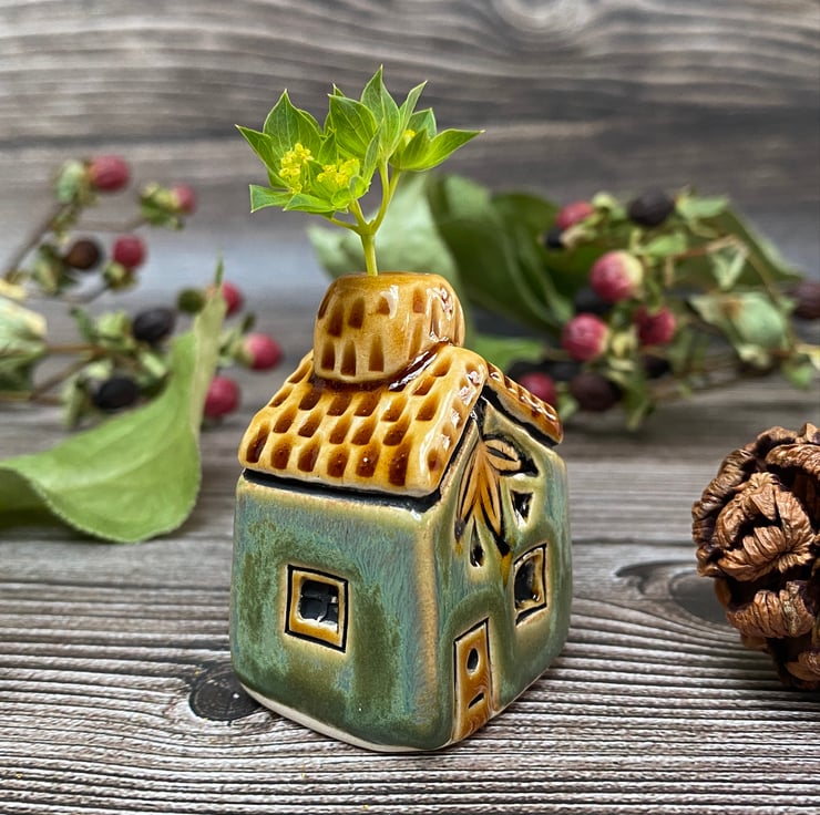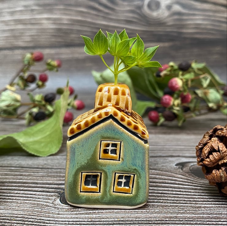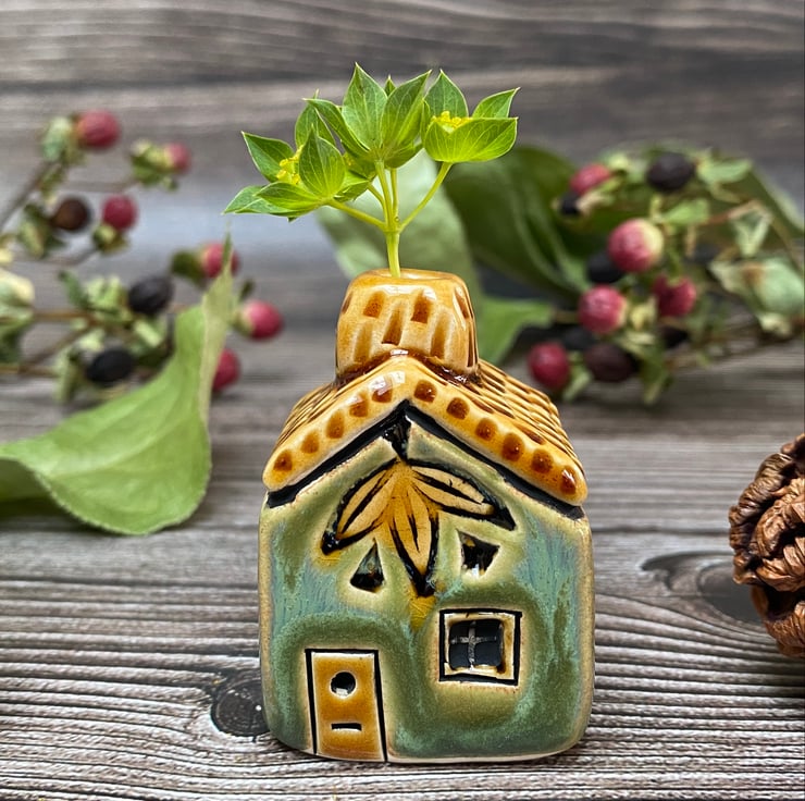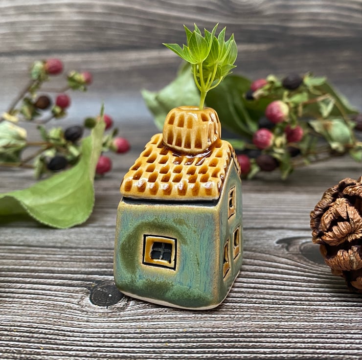 This little handmade ceramic house has been crafted from white earthenware clay and finished with hand-carved details on all sides, including windows, doors, and a beautiful honey coloured leafy detail on the front. The honey-coloured roof and chimney add warmth, while the green glaze with honey coloured accents gives it a warm and cosy feel. My favourite from this collection.