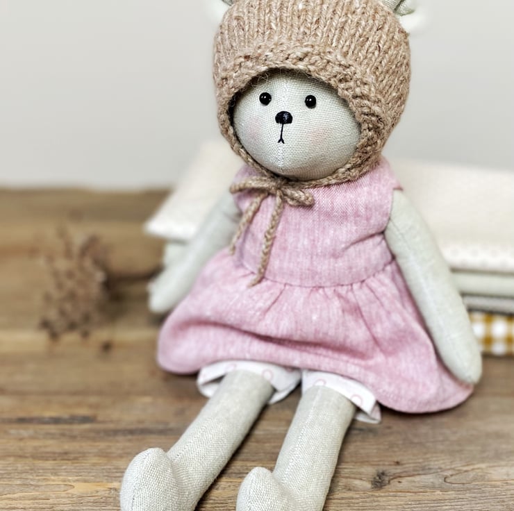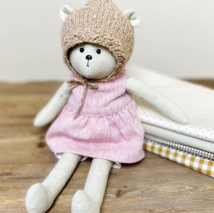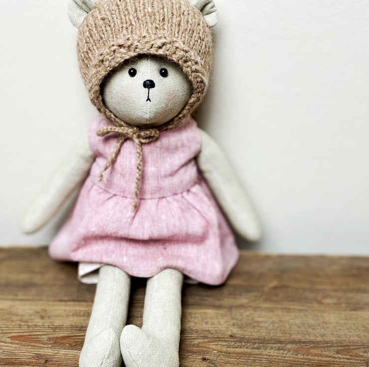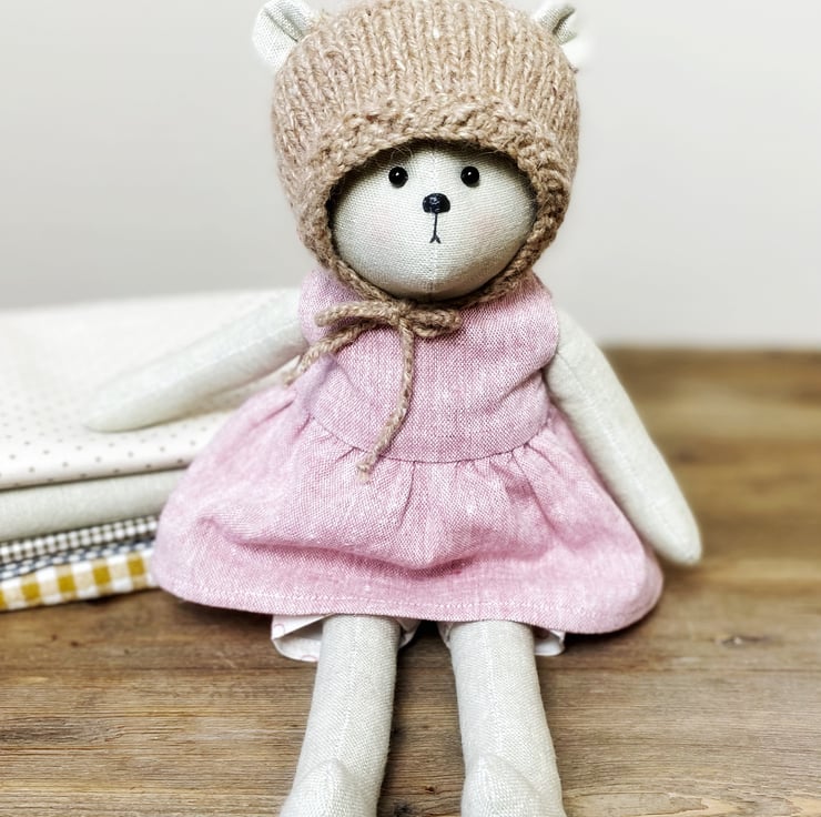 Her clothes are handmade and knitted by me, and she wears a pretty pink linen blend dress with matching spotty shorts, and a woollen bonnet with ties. Betty is a single edition.