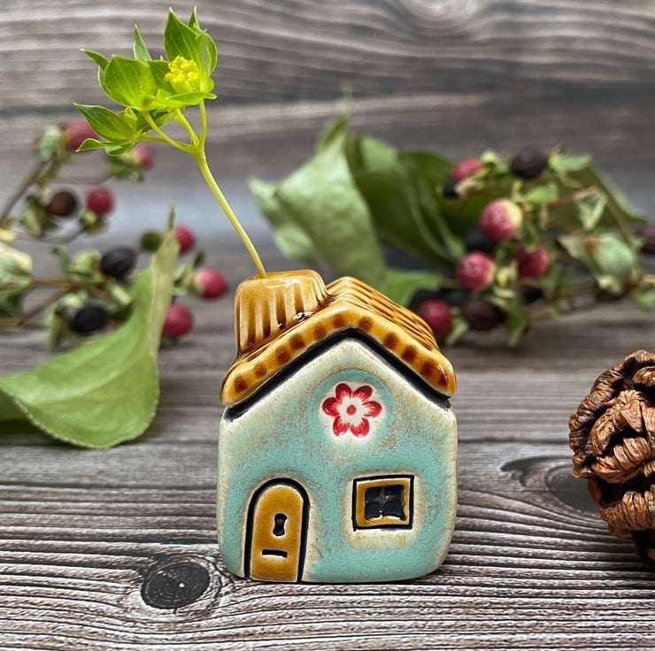 Ceramic Mini House with Chimney - Soft Green with Red Flowers