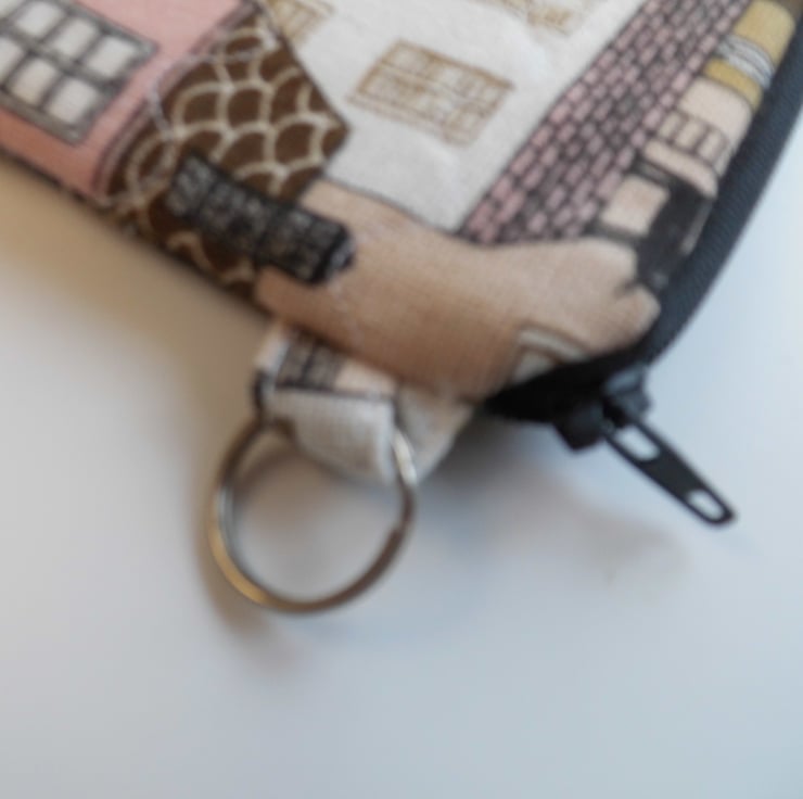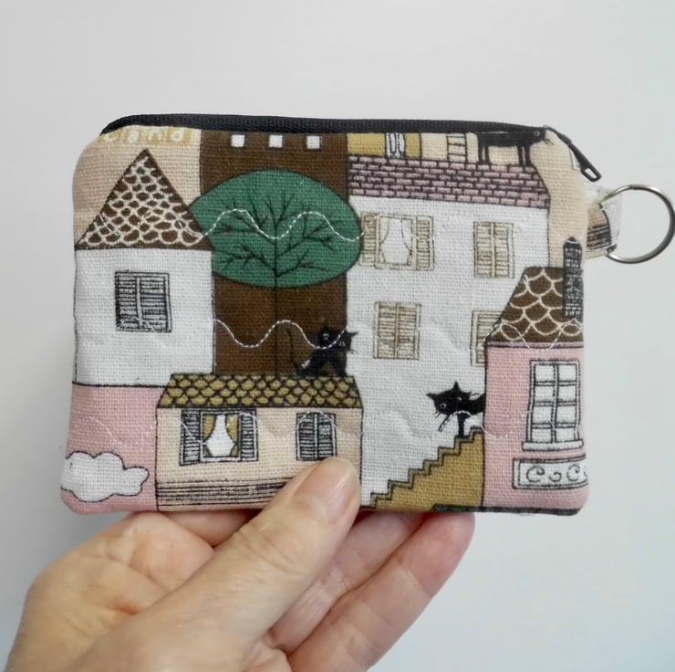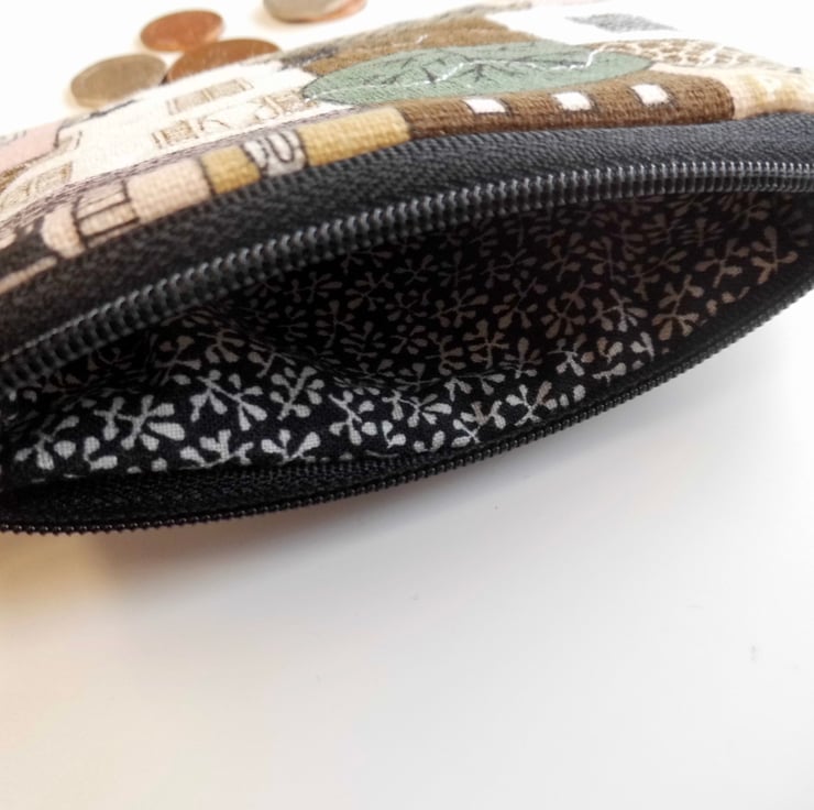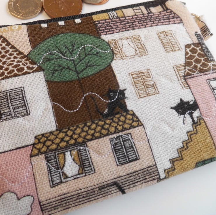 I made this coin purse using a canvas style 100% cotton fabric showing black cats having adventures up on the city rooftops. Soft pinks, beige, dark green and brown. The main fabric has been backed with fusible fleece and machine stitched three rows across each side with a wave stitch to achieve a lightly quilted effect.