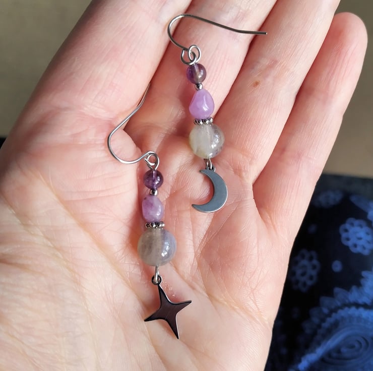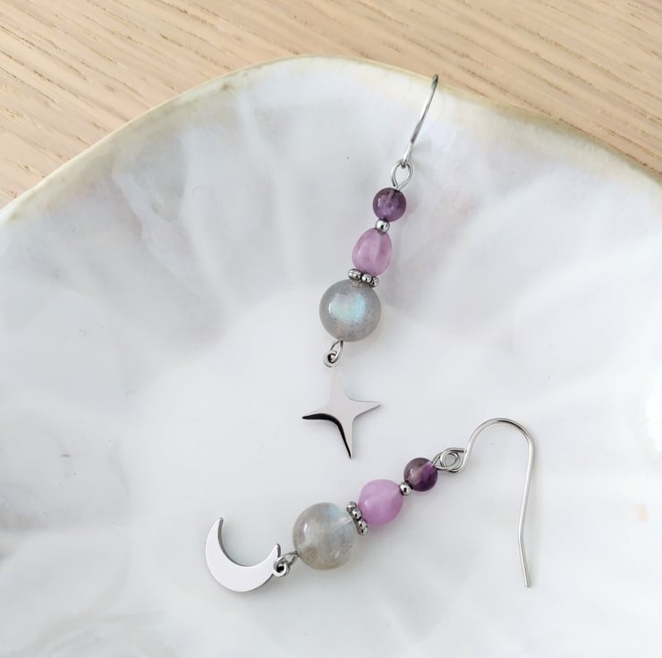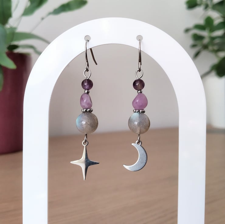 Earrings Amethyst Lepidolite Labradorite Bead Moon Star Silver Stainless Steel