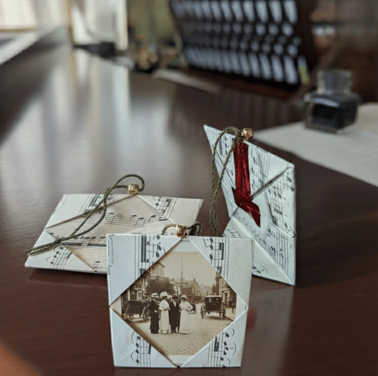 Each frame is folded by hand from authentic early 1900s vintage sheet music, giving it a unique charm and character.