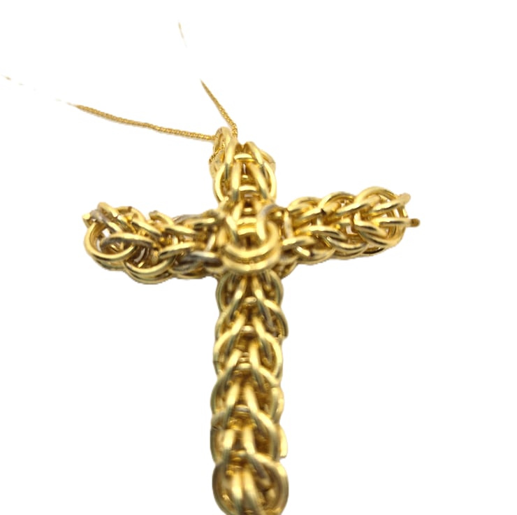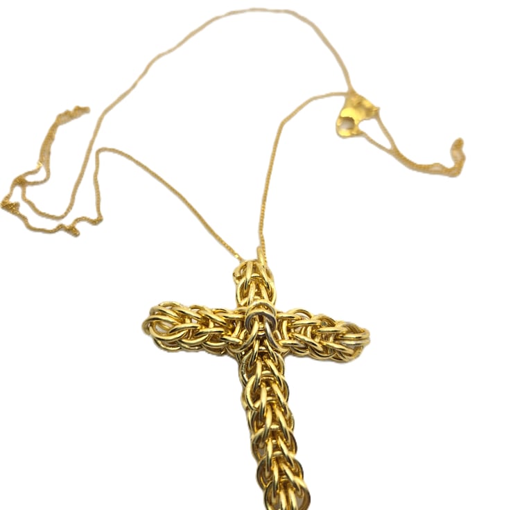 A chainmaille pendant in the shape of a cross made with gold plated jump rings