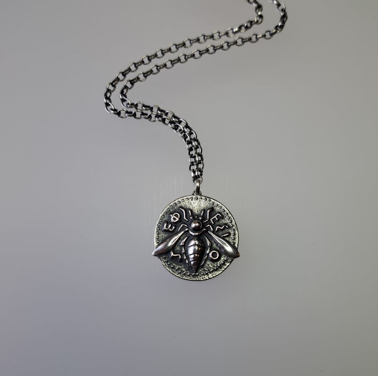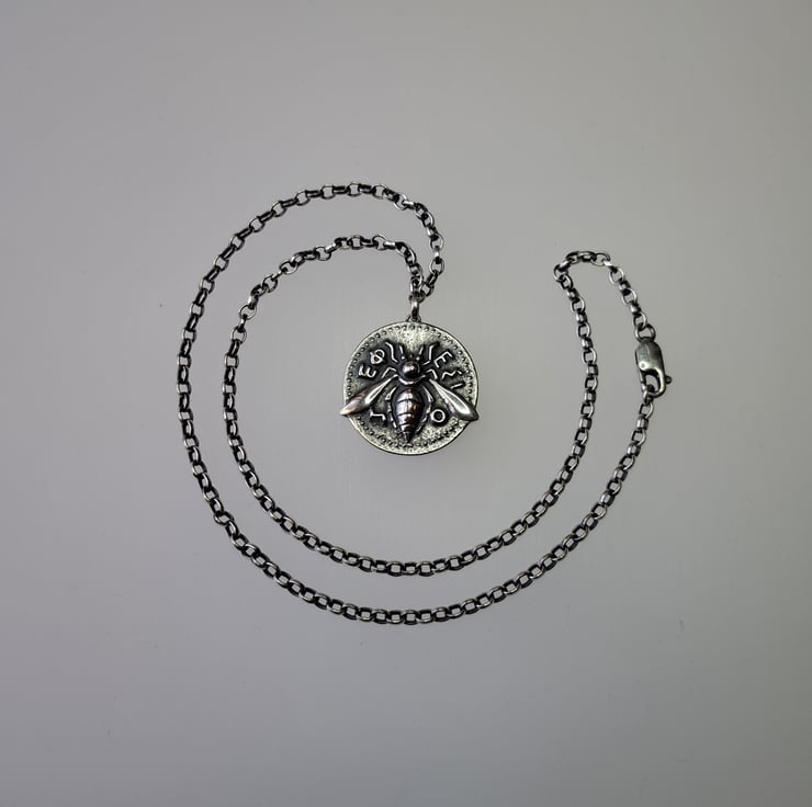 This sterling silver pendant is inspired by 4th century BC coinage from Ephesus, where the honey bee was sacred to Artemis Ephesia. Bees appear throughout her iconography: carved on her statues, pressed into archaic gold appliqués and even as titles for her temple attendants.
