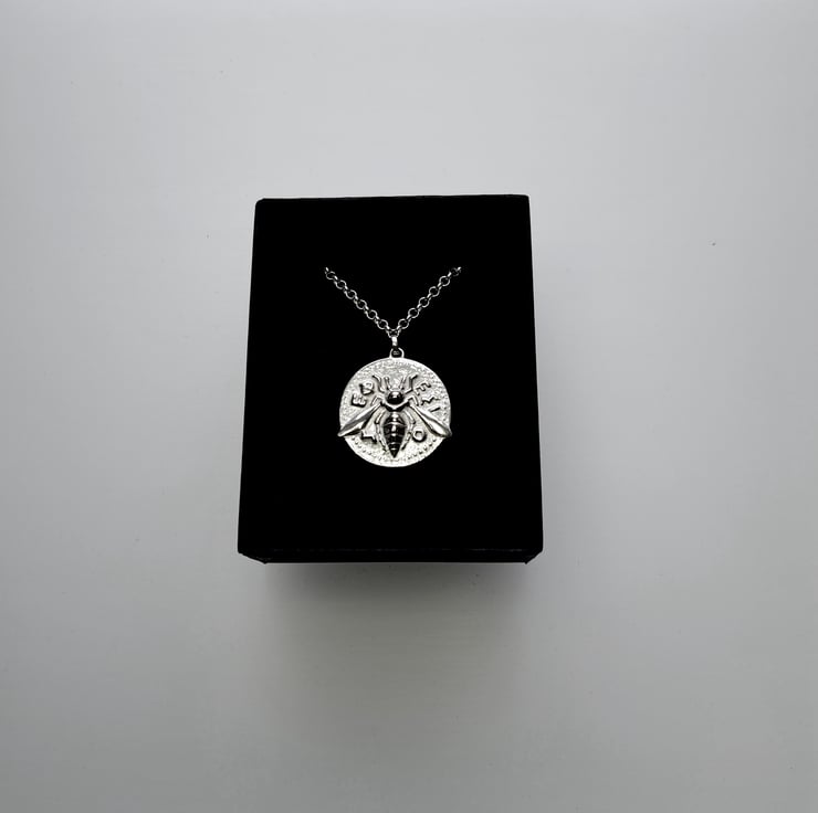 This sterling silver pendant is inspired by 4th century BC coinage from Ephesus, where the honey bee was sacred to Artemis Ephesia. Bees appear throughout her iconography: carved on her statues, pressed into archaic gold appliqués and even as titles for her temple attendants.