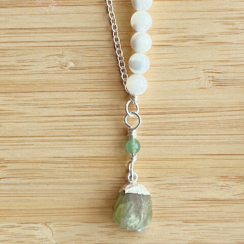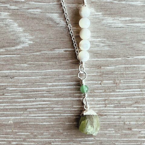 Silver chain with silver wire , mother of pearl and aventurine beads and a peridot raw crystal charm. Total length is just over 19 inches.