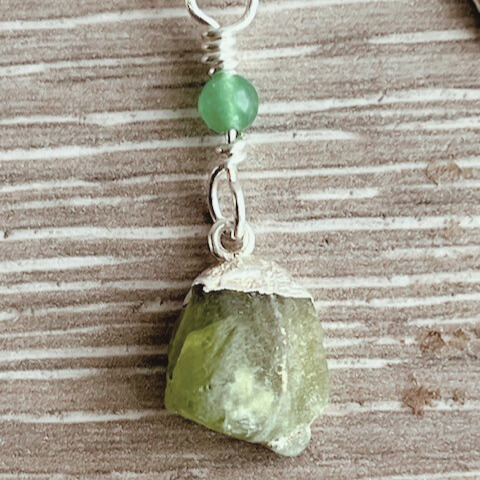 Silver pendant with peridot raw cystal charm.