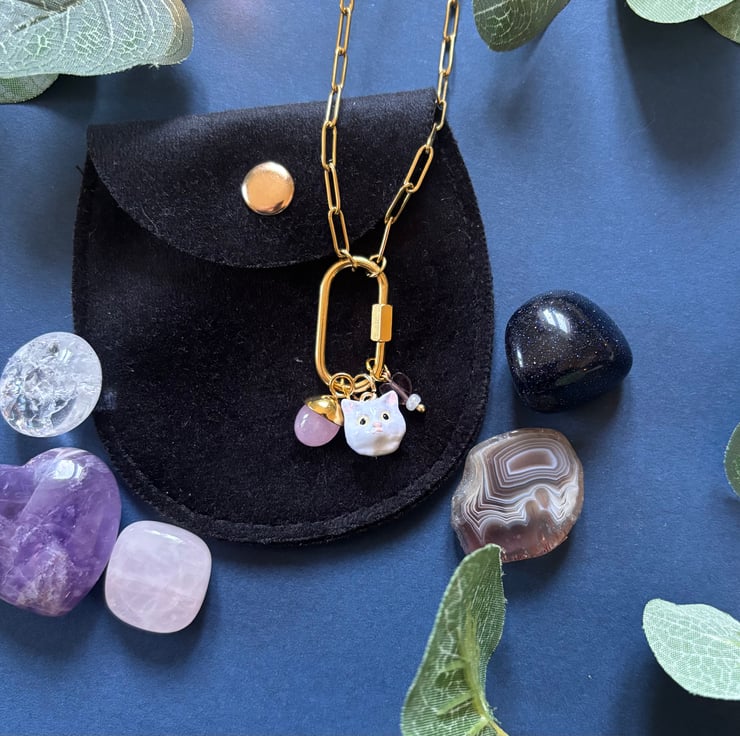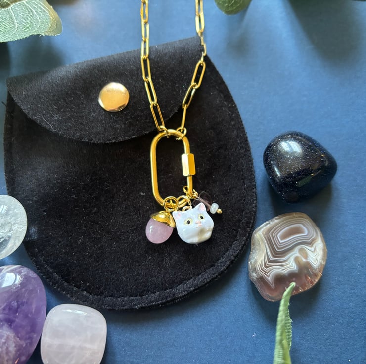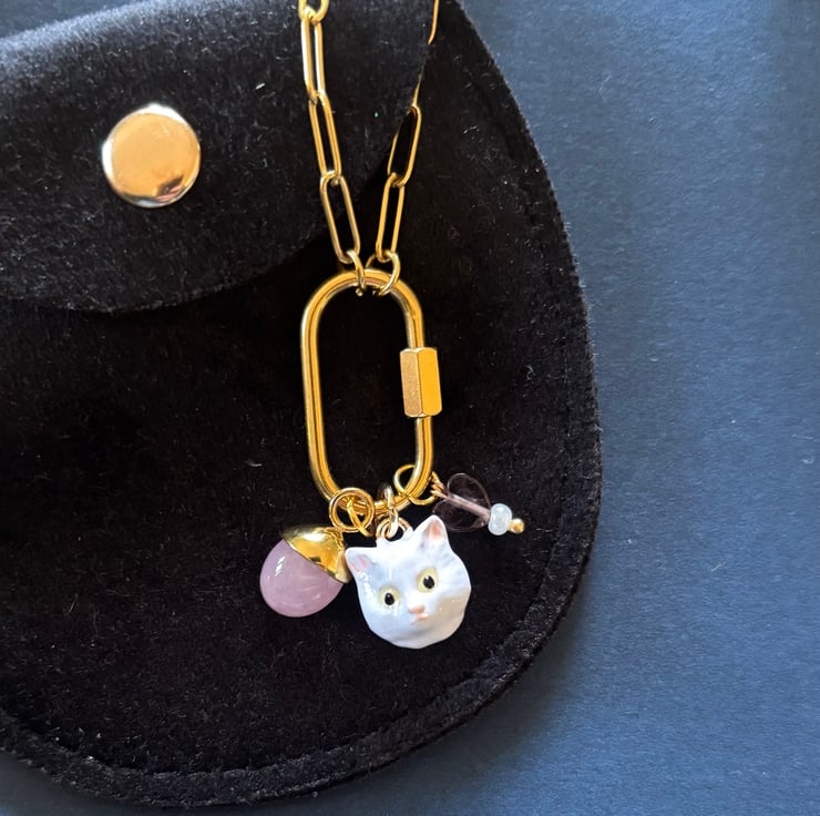 Cute chunky and weighted cat face with rose quartz charm and mini heart beads. On a gold coloured chunk chain.