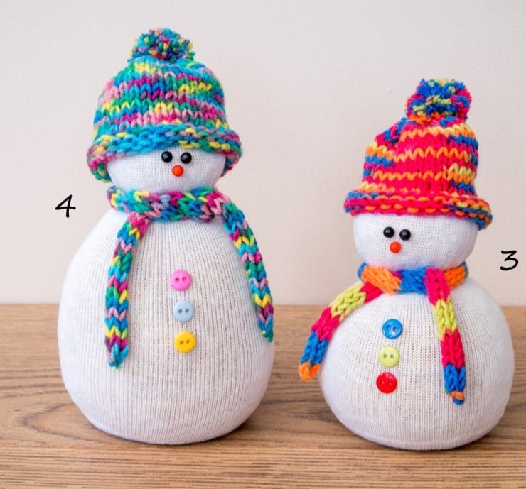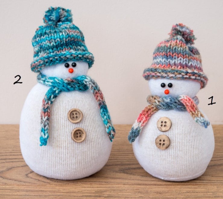 Rice-filled sock snowmen complete with handknitted hats and scarves! Can be purchased individually (1-4) or as a pair (1 and 2 or 3 and 4).