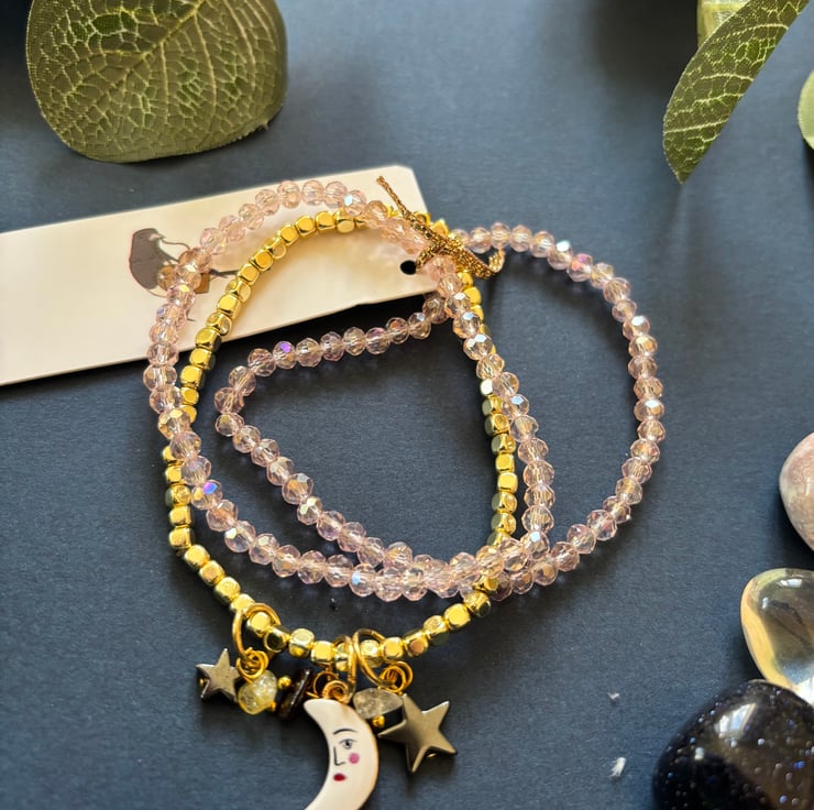 Three stretchy bracelets 1 gold coloured, 2 pink cut glass bracelets. With moon weighted pendant and star beads.
