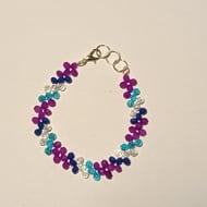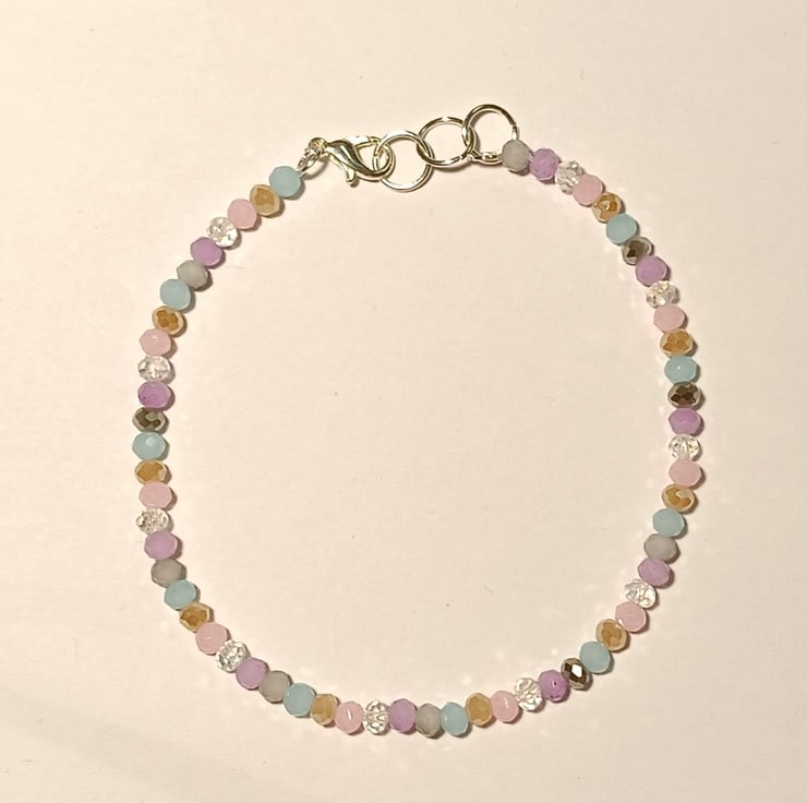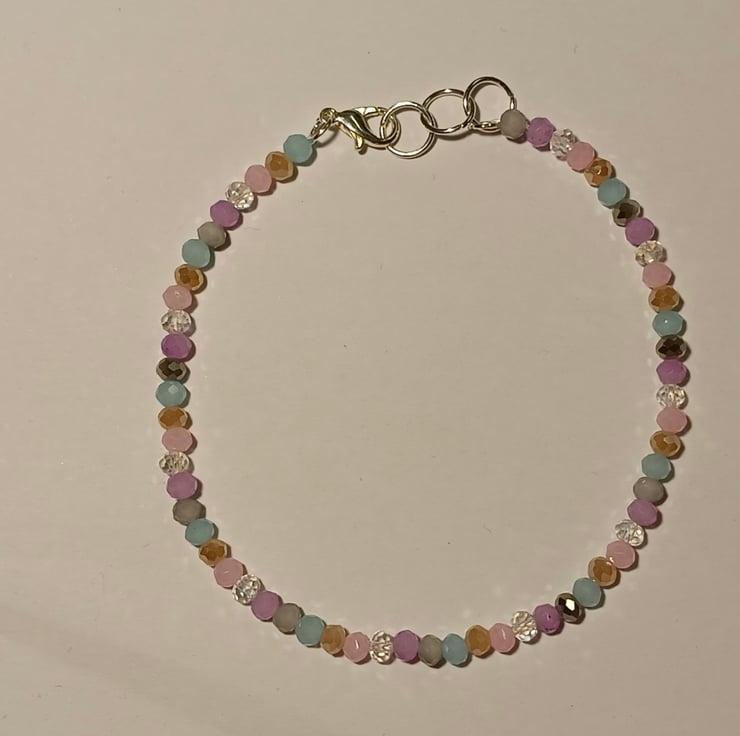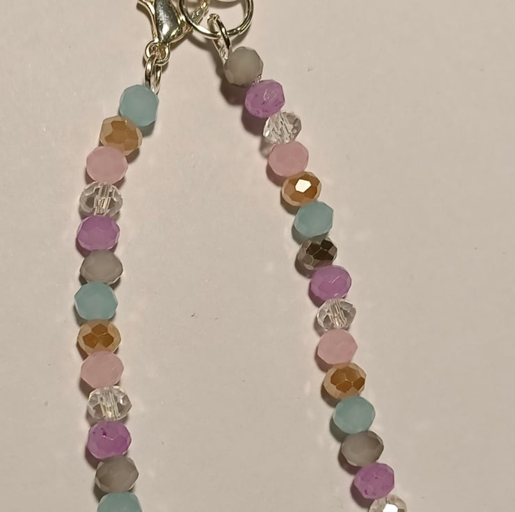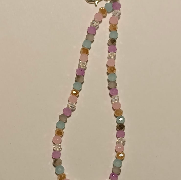 This unique piece is made of 4mm translucent light blue crystal beads , 4mm gold crystal beads, 4mm translucent light pink crystal beads, 4mm transparent clear crystal beads, 4mm purple crystal beads and 4mm two-toned silver and light grey crystal beads.
