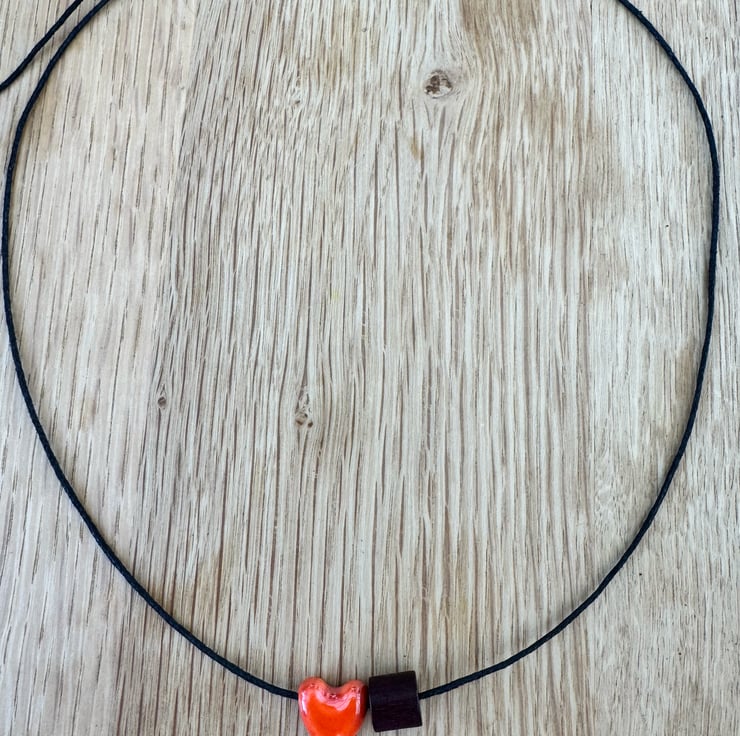 A warm and uplifting handmade necklace featuring a glossy orange ceramic heart paired with a dark wooden bead for a natural contrast.