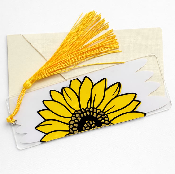 Brighten up your reading time with this cheerful sunflower tassel bookmark. Featuring a bold yellow sunflower design on a clear durable acrylic base. This bookmark is both eye catching and practical. The glossy finish makes the bookmark pop, whilst the soft yellow tassel adds a touch of calm and makes it easy to find your place in any book. Each bookmark comes with a textured cream card envelope making it beautifully presented and ready for gifting.