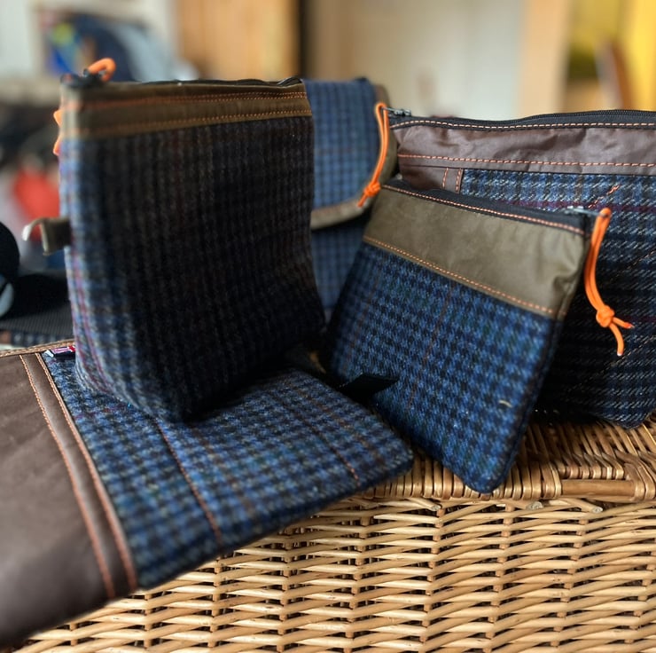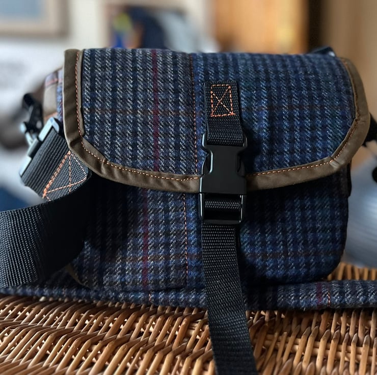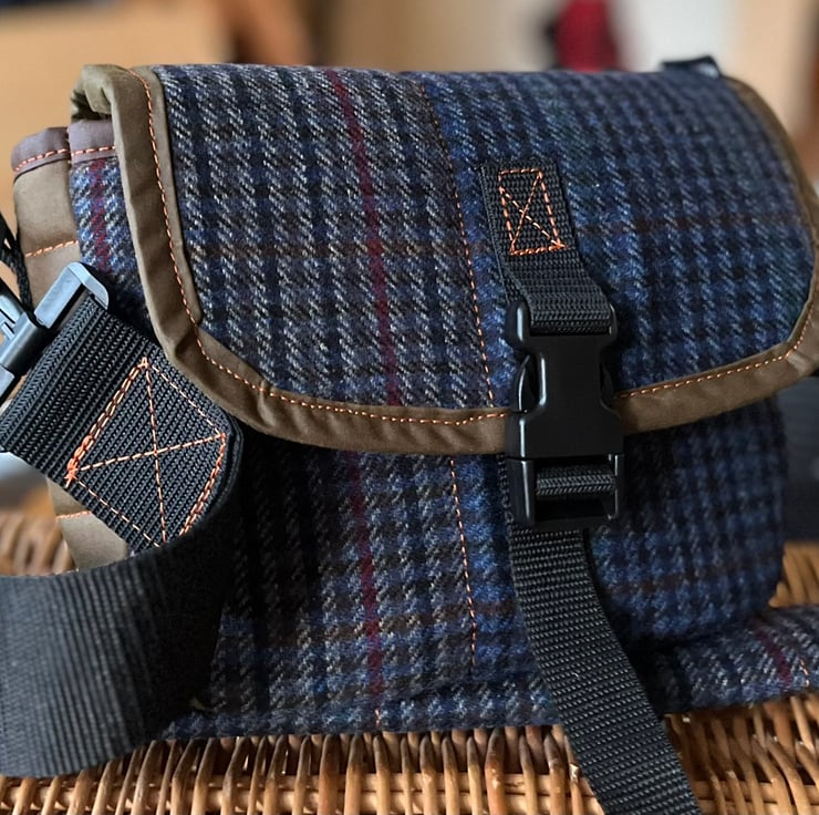 Clutch shooting bag to hold _+70-80 12G rounds, padded belt with adjuster, made from end of line Harris tweed and wax cotton, 90% recycled plastics nylon clasps and webbing, this one is one of one in this colour way, i can make others but not in the colour, see the other pouches and grab bags for sale, 1:5 only.